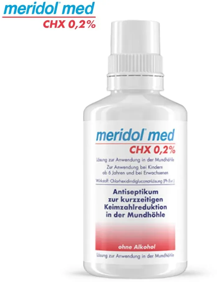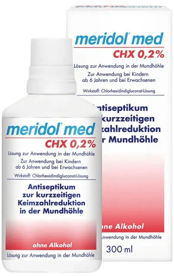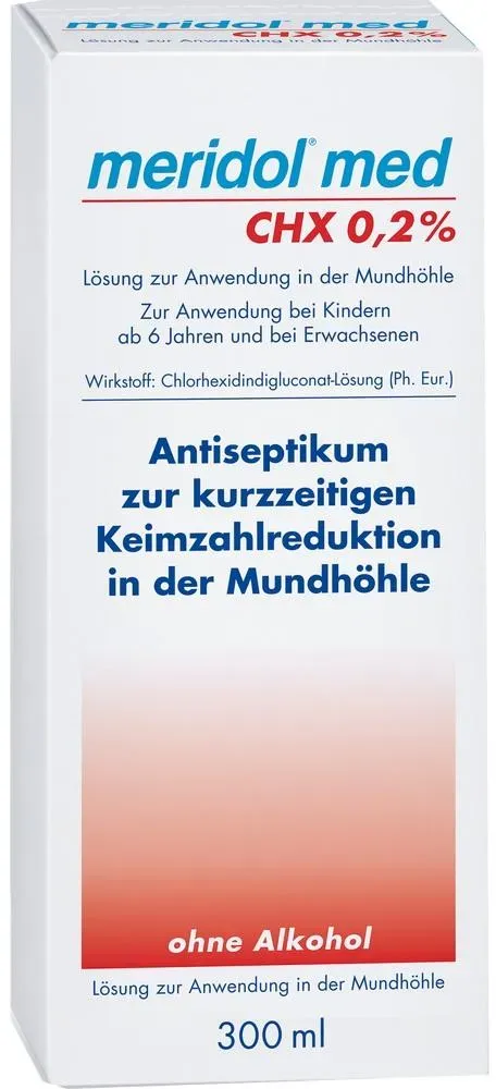 EAN: 4007965138003 - Wirkstoff: Chlorhexidindigluconat-Lösung (Ph.Eur.). Anwendungsgebiete: Zur zeitweiligen Keimzahlreduktion in der Mundhöhle, als zeitweilige und unterstützende Therapie zur mechanischen Reinigung bei bakteriell bedingten Entzündungen des Zahnfleisches (Gingiva) und der Mundschleimhaut sowie nach parodontalchirurgischen Eingriffen, bei eingeschränkter Mundhygienefähigkeit. Packungsbeilage beachten. Arzneimittel für Kinder unzugänglich aufbewahren. Die Mundspülung meridol med CHX 0,2 % ist ein hochwirksames Antiseptikum mit Chlorhexidin zur kurzzeitigen, massiven Keimzahlreduktion. Das Antiseptikum mit Chlorhexidin eignet sich als unterstützende Therapie bei Zahnfleischentzündungen (Gingivitis) und Mundschleimhautentzündungen. Auch nach parodontalchirurgischen Eingriffen und bei eingeschränkter Mundhygienefähigkeit ist die meridol med CHX 0,2 % die optimale Wahl. Die Packungsgröße von 300 ml ist für eine Anwendung von bis zu 14 Tagen ausreichend. meridol med CHX 0,2 % - erhältlich in Ihrer Apotheke. - bei ipill.de - aus Yadore Produktdaten ![]() ![]() Meridol med CHX 0,2% Lösung zur Anwendung in der Mundhöhle 300 ml Lösung