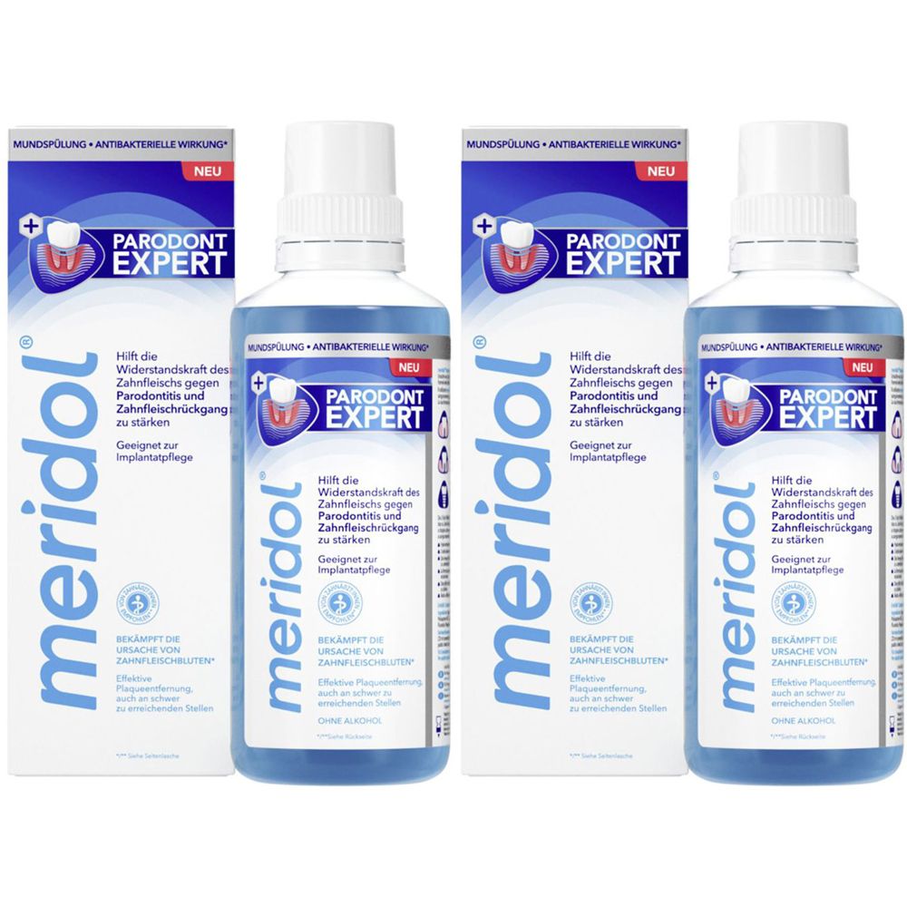 Kategorie: Zahnpflegeartikel - Meridol - GTIN:8718951560802 - Meridol Parodont Expert Mundspülung 400 ml - 10,26 Euro bei Amazon Marketplace Health & Personal Care - gefunden von billiger.de Ein praktisches Doppelpack der Zahnfleischschutz-Mundspülung ohne Alkohol, ideal für den Vorrat. ![]() ![]() Meridol 2x Meridol Mundspülung Zahnfleischschutz 400ml - ohne Alkohol