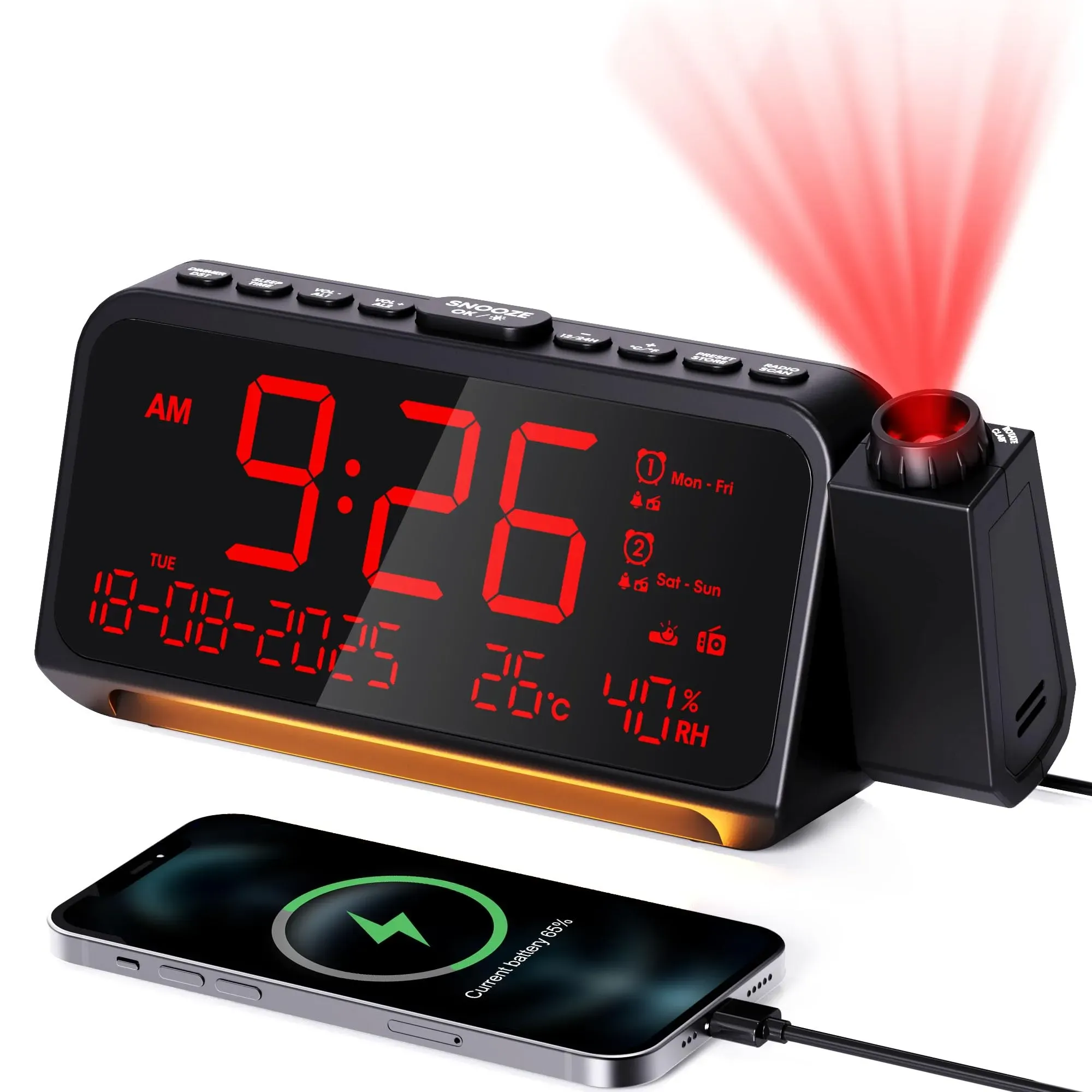 Auf Lager Versand durch AmazonRadiowecker Digital, Projektionswecker, FM Radio und Auto-Off-Timer, 320°Projektor mit Dimmer, Wochenendmodus, Dual-Alarm, Temperatur und Luftfeuchtig, Wecker Laut mit Projektion für Decke, Wand