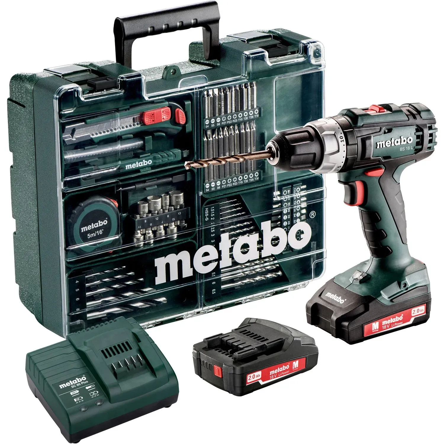 Auf Lager Versand durch Amazonmetabo Akku-Bohrschrauber BS 18 Set - 18 V, 74-tlg. Mobile Werkstatt - Schnellspannbohrfutter, Gürtelhaken, LED-Arbeitslicht - Inkl. 2 x Akku LiPOWER (2.0 Ah), Ladegerät und Kunststoffkoffer