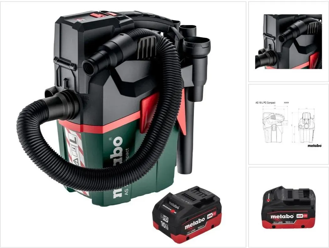 6 Händlerangebote bei billiger.de - Kategorie: Nass-/Trockensauger - Metabo - Lieferumfang: - 1x Metabo AS 18 L PC Compact Akku Sauger 18 V - 1x Stretch-Saugschlauch (Ø 32 mm / 0,5-2,5 m) - 3x Saugrohre aus Kunststoff - 1x Zwischenmuffe - 1x Vliesfilterbeutel - 1x Saugdüse (120 mm breit) - 1x Fugendüse - 1x Tragegurt - 1x Anschlussmuffe Innen-Ø 28 mm / Aussen-Ø 35 mm - 1x Metabo LiHD Akkupack 18 V 8,0 Ah Li-Ion Akku ( 625369000 ) CAS System - ohne Ladegerät Produktbeschreibung:Der Metabo AS 18 L PC Compact Akku-Sauger für Nass - und Trockensaugung eignet sich ideal für die die kleineren und Reinigungs - und Absaugarbeiten und ist, dank integrierter Blasfunktion, darüber hinaus auch ideal zum Ausblasen, Trocknen und Abluftausleitung geeignet. Dank der Staubklassen Klasse L ist eine gewerbliche Nutzung kein Problem. Die verbaute Press Clean Funktion sorgt für eine manuelle Filterabreinigung durch einen starken Luftstrom. Diese kann bei Nichtbenutzung des Saugers durch eine Schalterbetätigung durchgeführt werden. Darüber hinaus besitzt der Akkusauger einen ECO Modus der für eine verlängerte Akkulaufzeit sorgt, sowie einen Boost Modus für maximale Perfomance. Des Weiteren ist das Akkufach Spritzwassergeschützt und die Rohre direkt am Sauger montierbar. Die überlastungsschutzfunktion des Saugers sorgt für einen sofortigen Stopp und vermindert somit einen Schaden am Gerät. Der Transport z.B. für die Montage ist dank des ergonomischen Tragegriffs und dem ... Dieses Angebot beinhaltet den Akku-Sauger mit einem 10,0 Ah Akku, was eine lange Laufzeit für intensive Reinigungsarbeiten gewährleistet. ![]() ![]() Metabo, Industriestaubsauger, AS 18 L PC Compact Akku Sauger 18 V 6 l IPX4 Staubklasse L Nass und Trocken + 1x Akku 10,0 (Nass-Trockensauger)