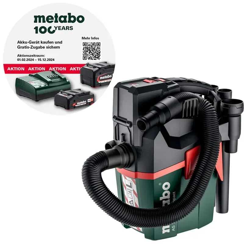 Metabo - EAN: 4061792197534 - Kaufen Sie ausgewählte Metabo Akku-Elektrowerkzeuge und erhalten Sie nach Registrierung auf portal.metabo-service.com/service-portal einen LiPOWER 18V 4.0Ah Akku GRATIS dazu (siehe auch PDF Datenblatt). Nur gültig vom 01.09.2025 bis 31.03.2026 und solange der Vorrat reicht! Die Registrierung muss bis spätestens zum Ablauf des 31.03.2026 und innerhalb von 4 Wochen ab Kaufdatum erfolgt sein. Jeder Teilnehmer ist berechtigt, maximal 5 qualifizierte Werkzeuge im Aktionszeitraum zu registrieren. . Lieferung ohne Akku und Ladegerät . Stromversorgung mit 18V Akku . Staubklasse L zertifiziert - trockene Stäube mit Arbeitsplatzgrenzwert 1 mg/m . Manuelle Filterabreinigung PressClean - starker Luftstrom bei Schalterbetätigung . Blasfunktion - für Ecken, in denen Saugen schwer möglich ist . Mit 2 Leistungsstufen (Eco, Boost) & 6 Liter Behältervolumen . Je nach Anwendung mit und ohne Staubsaugerbeutel verwendbar . Nass- und Trockensaugen (IPX4) - ideal für kleinere Reinigungs- & Absaugarbeiten . Uneingeschränkter Bewegungsradius dank Akku-Technologie . Staub- und spritzwassergeschützes Akkufach mit verschließbarer Klappe . Schlauch, Rohre und Düsen direkt am Sauger verstaubar . Einfacher Transport mit ergonomischem Tragegriff oder Tragegurt Merkmale: Betriebsart: Akku, kabellos Staubklasse: Staubklasse L Behältervolumen: 6 Liter Motorleistung: 18 Volt Ausführung: beutellos weitere Produktinformationen: Lieferung: inkl. Saugschlauch Stretch 0,5 - 2,5m / ... Ein sehr günstiges Angebot für den Metabo AS 18 L PC Compact Akku-Sauger, ideal für den gelegentlichen Gebrauch oder als Zweitgerät. ![]() ![]() Metabo AS 18 L PC Compact Akku-Sauger - Schwarz
