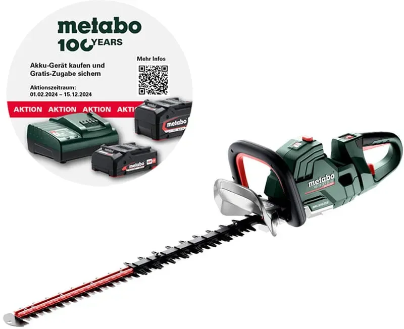 26 Händlerangebote bei billiger.de - Kategorie: Heckenscheren - Metabo - Kraftvolle, bürstenlose Akku-Heckenschere mit drehbarem Griff für komfortablen Trimm- und Rückschnitt. Starker Brushless-Motor für maximale Schnittleistung und lange Akkulaufzeit. Hocheffizientes, präzises Dual-Schnittsystem durch beidseitig diamantgeschliffene und lasergeschnittene Messerzähne. Drehbarer Handgriff mit 5 Positionen für sicheres und flexibles Führen der Heckenschere. Komfortable Zweihand-Bedienung durch langen Schalterdrücker und innenliegenden Bügelgriffschalter. Sicheres Arbeiten durch perfekte Balance, Softgrip-Handgriff, Griffschutz am Messer und Schnellstopp (in 0,2 Sekunden). Robust im Einsatz durch Magnesium-Getriebegehäuse und geschützte Position des Akkupacks. Anstoßschutz schützt Anwender und Getriebe vor Rückschlägen bei Arbeiten in Wand- und Bodennähe. Platzsparende Aufbewahrung an der Wand durch praktische Aufhängeöse. Umweltfreundlich und leise durch Akkubetrieb, dadurch auch in lärmsensiblen Bereichen einsetzbar. - GTIN:4061792228443 Ein attraktives Angebot für die bürstenlose Metabo HS 18 LTX BL 65 ohne Akku, ideal für langlebige Leistung. ![]() ![]() Metabo Akku-Heckenschere HS 18 LTX BL 65 - Karton - 601723850
