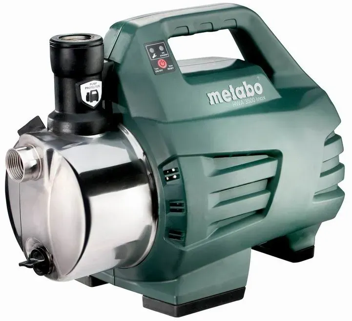 Kategorie: Hauswasserwerke - Metabo - GTIN:4007430240514 - Metabo Hauswasserautomat HWA 3500 Inox Leistungsstark, zuverlässig und langlebig Metabo HWA 3500 Inox Hauswasserautomat die ideale Lösung für die automatische Wasserversorgung im Haus und Garten. Mit robuster Edelstahl-Pumpe, hoher Förderleistung und intelligenter Steuerung überzeugt dieser Hauswasserautomat durch Effizienz und Langlebigkeit. Hauptmerkmale & Vorteile: Leistungsstarker 900-Watt-Motor für eine zuverlässige Wasserversorgung Maximale Fördermenge: 3.500 Liter pro Stunde ideal für Gartenbewässerung, Toilettenspülung, Waschmaschine u.v.m. Robustes Pumpengehäuse aus rostfreiem Edelstahl (Inox) für maximale Haltbarkeit Automatikbetrieb mit integriertem Druckschalter Wasser fließt nur bei Bedarf Thermoschutzschalter zum Schutz des Motors vor überhitzung Trockenlaufschutz für sicheren Betrieb bei niedrigem Wasserstand Wartungsfreier Kondensatormotor für geräuscharmen Dauerbetrieb Metabo Pump Protection: automatischer Trockenlaufschutz mit LED-Anzeige zum Schutz der Pumpe und für hohe Anwendersicherheit Hochwertiges Gleitringdichtungssystem für lange Lebensdauer Separate Wasser-Einfüllöffnung für komfortable Inbetriebnahme der Pumpe Werkzeuglose Wasser-Ablassschraube zum Schutz bei Frostgefahr Gummierte Füße für geräusch- und vibrationsarmen Betrieb Für die Gartenbewässerung mit 1 oder 2 Regnern Ideal geeignet für: Gartenbewässerung mit Regenwasser Hauswasserversorgung aus Brunnen oder Zisternen Druckerhöhung ... ![]() ![]() Metabo Hauswasserautomat HWA 3500 Inox Edelstahl Bewässerung Fördern Klarwasser