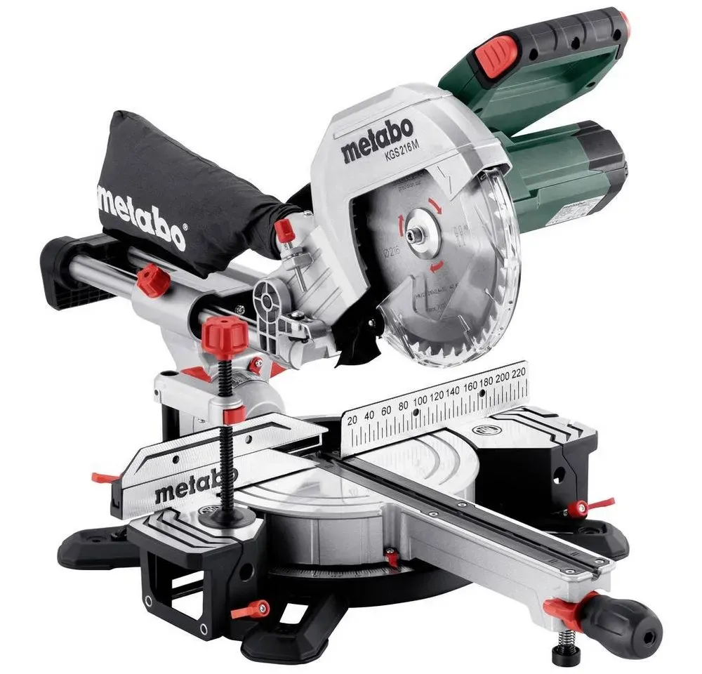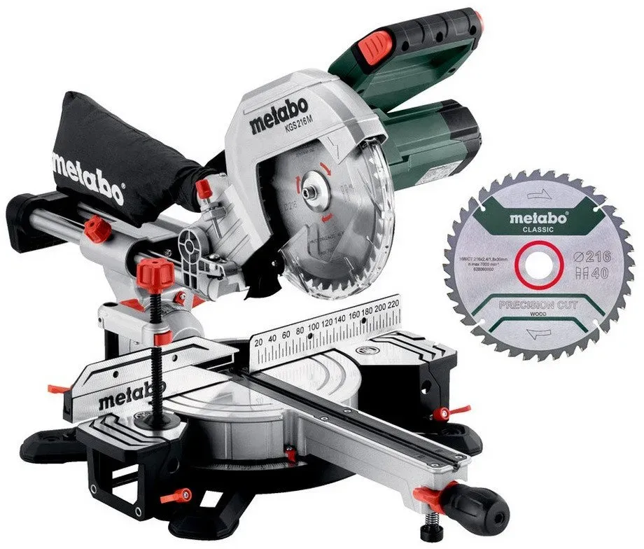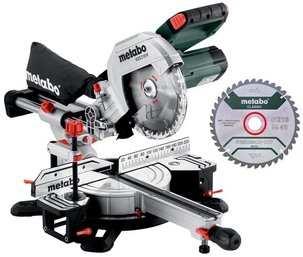 Kategorie: Kappsägen - Metabo - GTIN:4061792221222 - Kapp- und Gehrungssäge der mobilen M-Klasse mit Zugfunktion - leicht, präzise, anwenderfreundlich. Precision Cut Line (PCL): exakte Schatten-Schnittlinie ohne Nachjustieren durch clever platzierte LED. Grosse Schnittkapazität durch Zugfunktion für breite Werkstücke. Drehteller mit schneller, präziser Einstellung gängiger Winkel über Rastpunkte. Sägeblattneigung von -2 bis 47 , somit für Hinterschnitte geeignet. Robuste Bauweise aus Aluminiumdruckguss für härteste Ansprüche. Effektive Spanabsaugung über integrierten Spänefangtrichter. Sanftanlauf für lange Lebensdauer von Motor und Getriebe. Ausziehbare Tischverbreiterungen, auch abnehmbar zum Unterlegen extrem langer Werkstücke. Schnellspannzwinge zur sicheren Fixierung des Werkstücks von oben oder von vorne. Tiefenanschlag zur einfachen Herstellung von Nuten. Alle Skalen und Bedienelemente aus Arbeitsposition einsehbar und intuitiv bedienbar. Ergonomische Griffbereiche für ein- oder beidhändiges Tragen. Lieferumfang: Sägeblatt 'Precision cut wood - classic' 216x30 Z40, 2 integrierte Tischverbreiterungen, Ablänganschlag, Materialklemme, Werkzeug für Sägeblattwechsel, Kabelaufwicklung, Spänefangsack. - 183,82 Euro bei Galaxus.de - gefunden von billiger.de Ein weiteres attraktives Angebot für die Metabo KGS 216 M zu einem sehr guten Preis. ![]() ![]() Metabo, Kappsäge + Gehrungssäge, KGS 216 M