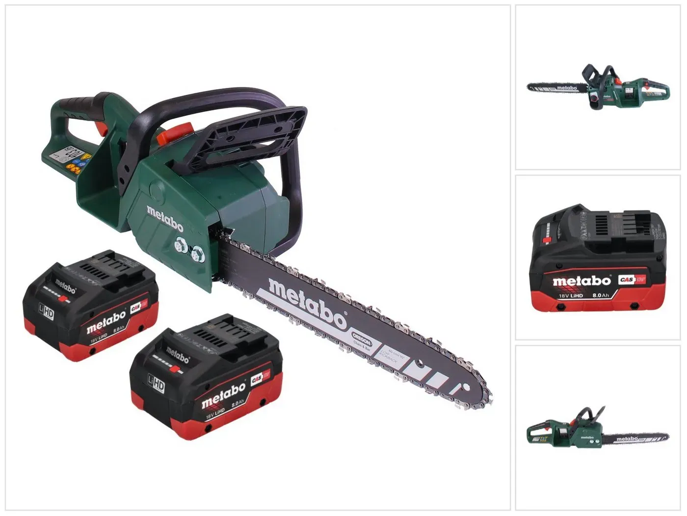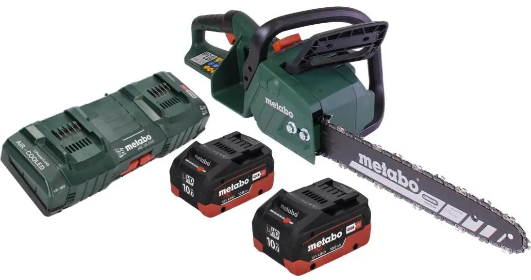 Kategorie: Kettensägen - Metabo - GTIN:4064677075262 - ' Lieferumfang: - 1x Metabo MS 36-18 LTX BL 40 Akku Kettensäge 18 V - 2x Metabo LiHD Akkupack 18 V 8,0 Ah Li-Ion Akku ( 625369000 ) CAS System - 1x Metabo ASC 145 Ladegerät ( 627378000 ) Produktbeschreibung: Bei der Akku Motorsäge handelt es sich um eine durchzugsstarke Akkukettensäge. Mit der MS 36-18 LTX BL 40 sind schnelle und gleichmäßige Schnitte beim Fällen, sowie Entasten, Ablängen und Bauen mit Holz möglich. Der kraftvolle wartungsfreie Brushless-Motor mit Direktantrieb bietet eine maximale Akkulaufzeit und eine höchst Kettengeschwindigkeit bis zu 22 m/s. Aufgrund der stufenloser Geschwindigkeitssteuerung, bietet die Akku Motorsäge ein flexibles Arbeiten. Durch die Rückschlagarme Kette, bietet die Maschine eine leichtgängige und sichere Schnitte mit geringer Vibration. Bei Rückschlag und Loslassen des Schalters, gewährleistet die Kettensäge einen maximalen Anwenderschutz durch den Kettenschnellstop. Der Sicherheitsschalter greift bei einem unbeaufsichtigten Starten ein. Darüber hinaus verfügt die MS 36-18 einen hohen Arbeitskomfort, durch den gummierten Handgriff, kompakte Bauform und geringes Gewicht im Vergleich zu Benzin-Kettensägen. Bei minimalen Wartungsaufwand verfügt die Akku Kettensäge über eine automatische Kettenschmierung, sowie ein einfaches Nachspannen und Wechseln der Sägekette. Zum bequemen kontrollieren und Nachfüllen des Kettenöls, dient der halb transparente öltank mit Schnellverschluss. Für ... Ein leistungsstarkes Paket für die MS 36-18 LTX BL 40 mit zwei 8,0 Ah Akkus, das eine hohe Performance für anspruchsvolle Aufgaben bietet. ![]() ![]() Metabo, Kettensäge, MS 36-18 LTX BL 40 Akku Kettensäge 36 V ( 2x 18 V ) 40 cm 22 m/s Brushless + 2x Akku 8,0 Ah (Akku Kettensäge)