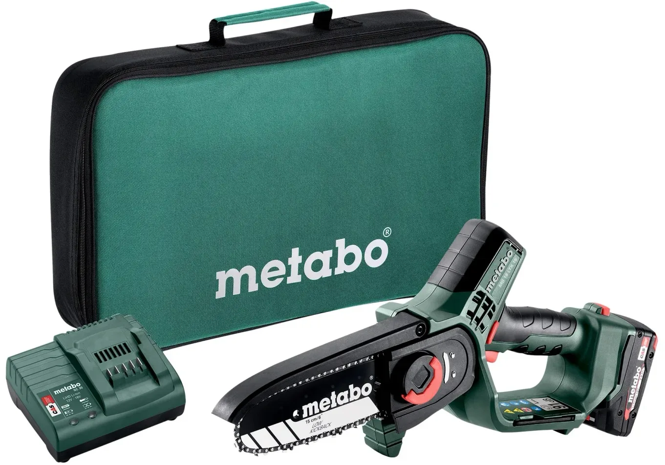 4 Händlerangebote bei billiger.de - Kategorie: Kettensägen - Metabo - Lieferumfang: - 1x Metabo MS 18 LTX 15 Akku Gehölzsäge - 1x Sägeschiene 15 cm - 1x Sägekette 15 cm (1/4' LP, 1,1 mm) - 1x Sägekettenschutz - 1xSägekettenhaftöl 100 ml - 1x Sechskantschlüssel mit Kugelkopf - 2x Metabo Li-Power Akkupack 18 V 4,0 Ah CAS Akku - 1x Metabo ASC 55 Ladegerät - 1x Metabo metaBOX Produktbeschreibung:Die Metabo MS 18 LTX 15 Akku Gehölzsäge 18 V ist eine handliche und sichere Motorsäge, die ideal für den Rückschnitt von Bäumen und Sträuchern sowie für Grünschnittarbeiten geeignet ist. Dank ihres leistungsstarken Motors und der konstant hohen Kettengeschwindigkeit unter Last ermöglicht sie einen zügigen Sägefortschritt. Mit dem optionalen Teleskopstab MS (Zubehör) kann die Mini-Motorsäge auch wie ein Hochentaster verwendet werden, um auch höhergelegene äste problemlos zu erreichen. Der Akku der Gehölzsäge ermöglicht bis zu 60 kraftvolle Schnitte in Hartholz mit einem Durchmesser von 80 mm mit nur einer Akkuladung. Für ein sicheres Arbeiten verfügt die Säge über eine Schutzhaube, einen Griffschutz und einen Sicherheitsschalter, der ein unbeabsichtigtes Starten verhindert. Die kompakte Bauform, das geringe Gewicht und die gummierten Griffbereiche sorgen für ein einfaches Handling und eine angenehme Handhabung. Das Wechseln und Spannen der Sägekette ist dank des Schnellverschlusses und des am Gehäuse deponierten Spannwerkzeugs einfach und bequem. Ein weiterer Vorteil der Metabo MS 18 LTX ... Ein ausgewogenes Paket mit einem 5,5 Ah Akku, Ladegerät und metaBOX, das für viele Anwendungen ausreichend Leistung und Komfort bietet. ![]() Metabo, Kettensäge, MS 18 LTX 15 Akku Gehölzsäge 18 V 15 cm 5 m/s + 1x Akku 5,5 Ah + Ladegerät + metaBOX (Akku Kettensäge)