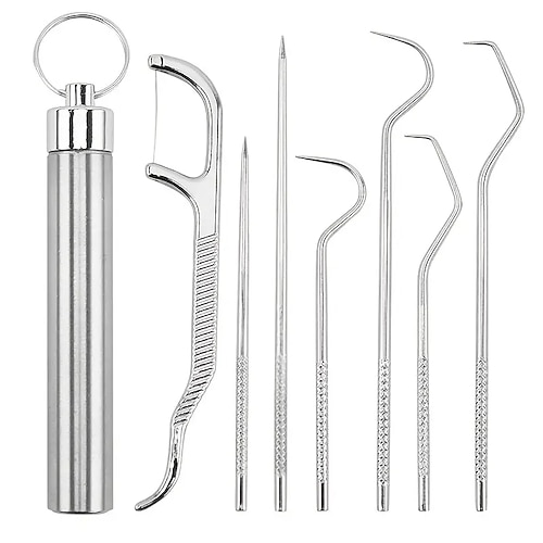 Kategorie: Sonstige Küchenhelfer - SZXMDKH - ?Tragbar und leicht? Mit einem hängenden wasserdichten Ring ist es bequem für Sie, es an Ihren Schlüsselbund, Jeans-Tasche, Geldbörse zu hängen und mitzunehmen, geringes Gewicht und kleine Größe, einfach zu tragen. ?Hochwertiges Material?: Tragbare Zahnstocher sind aus Titan, langlebig, korrosionsbeständig, harmlos für Ihren Körper, glatt und poliert, und wiederverwendbar. ?Geniales Design? Der Zahnstocher nimmt ein drehbares Verbindungsdesign an. Das Ende des Zahnstochers ist strukturiert, um Verletzungen durch Verrutschen der Hand zu vermeiden. Sicher zu verwenden, nicht zu scharf und besser für Ihre Zähne. Mehrzweck-Werkzeug: Unsere Taschen-Zahnstocher können als praktischer Obstspießer verwendet werden. Sie helfen Ihnen, Ihren Telefonschlitz zu öffnen und die Partikel zu entfernen, die von Ihrem Computer-Tastaturblock übrig bleiben, perfekt für Camping, Wandern, Picknicks, Radfahren, Reisen und mehr. ?Leicht zu reinigen? Verwenden Sie leicht zu reinigende Materialien und wischen Sie sie mit einem feuchten Tuch ab. Titan-Zahnstocher sind nach dem Waschen, Trocknen und Aufbewahren langlebig und wiederverwendbar. - 6,77 Euro bei Amazon Marketplace Health & Personal Care - gefunden von billiger.de Ein 7-teiliges Edelstahl-Zahnstocher-Set, das als Obstgabel und für Outdoor-Aktivitäten geeignet ist. ![]() ![]() Cosswe 304 Edelstahl Zahnstocher Set, 7 Stück Tragbare Zahnstocher Metall Titan Zahnstocher Set Wiederverwendbar 304 Edelstahl Zahnstocher Obstgabel mit Halter für Outdoor Picknick Camping Freien
