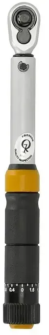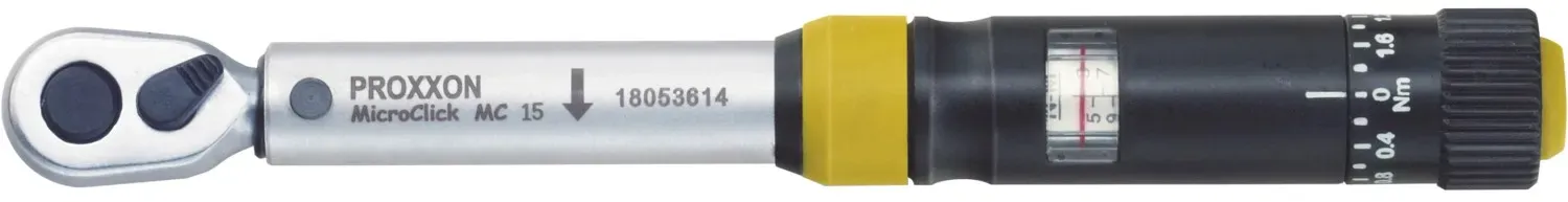 Kategorie: Schraubenschlüssel - PROXXON - GTIN:4006274233454 - Der Proxxon Drehmomentschlüssel MicroClick MC15 ist ein Präzisionswerkzeug für das Anziehen von hochwertigen Komponenten, die mit Drehmomenten zwischen 3 Nm und 15 Nm angezogen werden. Somit eignet sich der Drehmomentschlüssel für Reparaturen und Montagen beispielweise an Fahrrädern. Präzisionswerkzeug mit Klick über den gerändelten Ring am Griffende können Sie das gewünschte Drehmoment auswählen. Durch Einschieben wird der Wert fixiert. Ziehen Sie nun eine Schraube an, wird das Erreichen des gewählten Drehmoments mit einem hörbaren und fühlbaren Klick signalisiert. über eine analoge Skala mit 0,4 Nm-Teilung können Sie das Drehmoment exakt einstellen. Eine zusätzliche Mikro-Skala dient zur Feinjustierung. Die Genauigkeit des Derhmomentschlüssels liegt dabei bei +/- 3%. Hochwertiger Drehmomentschlüssel Der MicroClick ist mit einer Vierkant 6,3 mm (1/4 Zoll) Aufnahme ausgestattet und verfügt über einen zusätzlichen Adapter für Standard-Schrauberbits mit 6,3 mm (1/4 Zoll). über einen Umschalthebel können Sie zwischen Link- und Rechtslauf wechseln. Der stabile Stahlschaft ist mit einem Rostschutz versehen, doppelt vernickelt und anschließend verchromt. Die Proxxon Drehmomentschlüssel sind Stück für Stück kalibriert und endgeprüft. über die gelaserte, dauerhafte Seriennummer kann jeder Schlüssel eindeutig identifiziert werden. Im praktischen Kunststoffkoffer kann der Drehmomentschlüssel sicher transportiert und ... ![]() ![]() Proxxon MicroClick Drehmomentschlüssel MC15, für 3-15 Nm