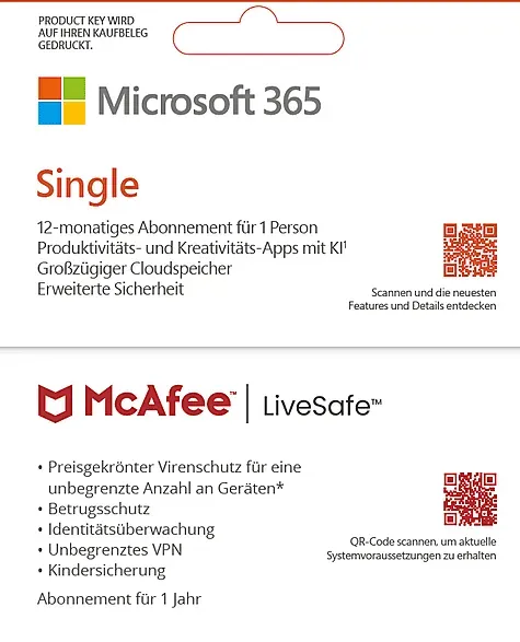 Kategorie: Software-Lizenzen - Microsoft - GTIN:4255809925467 - M365 Single Microsoft 365 Single umfasst 1 TB Cloud-Speicher, erweiterte Sicherheit und innovative Apps mit KI. Für 1 Person Benutzung auf bis zu 5 Geräten gleichzeitig Funktioniert mit PC, Mac, iPhone, iPad sowie Android-Smartphones und -Tablets 1 TB (1.000 GB) sicherer Cloudspeicher Produktivitäts-Apps mit Microsoft Copilot Designer KI-gestützte Bilderstellung und Bearbeitung Clipchamp-Videoeditor mit Premium-Filtern und -Effekten Microsoft Defender mit erweiterten Sicherheitsfunktionen für Ihre persönlichen Daten und Geräte OneDrive-Ransomware-Schutz für Ihre Fotos und Dateien Kontinuierlicher Support, wenn Sie Unterstützung benötigen Für die Verwendung von Copilot und das Erstellen von KI-Bildern gelten Nutzungsbeschränkungen. Die App-Verfügbarkeit variiert je nach Gerät/Sprache.Funktionen unterscheiden sich je nach Plattform und Region. McAfee LiveSafe (Windows, macOS, Android, iOS, ChromeOS) - Unbegrenzte Anzahl an Geräten - 1-Jahres-Abonnement McAfee LiveSafe bietet grundlegenden Schutz für Ihre persönlichen Daten, Geräte und Ihre Online-Privatsphäre. Die umfassende Sicherheitslösung beinhaltet eine preisgekrönte Virenschutzsoftware unterstützt durch die smarte McAfee-KITM, Echtzeit-Bedrohungserkennung, Betrugserkennung in SMS, Secure VPN, Identitätsüberwachung, sicheres Surfen und einen Kennwort-Manager. Mit McAfee LiveSafe sind Ihre Geräte und Daten zuverlässig vor den neuesten Online-Bedrohungen ... Dieses Angebot für 89.99 Euro bietet Microsoft 365 Single für 12 Monate, 1 Nutzer und 5 Geräte mit 1 TB Cloudspeicher als Download Code. ![]() ![]() Microsoft 365 Single, 12 Monate für 1 Nutzer (5 Geräte), TB Cloudspeicher, Download Code - [Multiplattform]