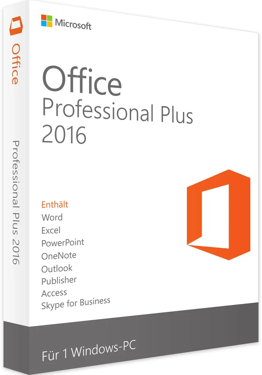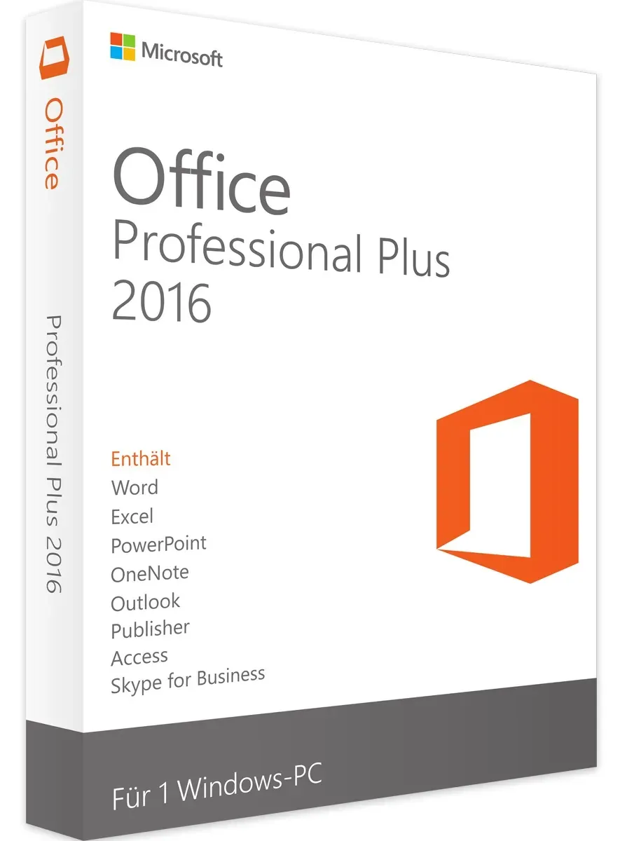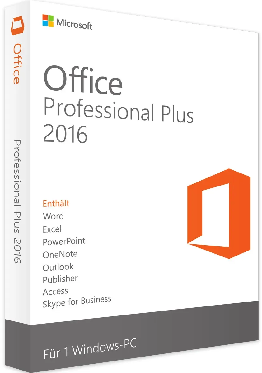 Kategorie: Office-Software - Microsoft - GTIN:5711783158080 - 'Office 2016 Professional Plus'. Microsoft Office Professional Plus 2016: Bürosoftware für professionelle Anwender. Büroarbeiten zählen in vielen Betrieben zu den alltäglichen Aufgaben. Um diese schnell und zuverlässig zu erledigen, ist es wichtig, eine hochwertige Bürosoftware zu verwenden. Microsoft Office Professional Plus 2016 eignet sich hierfür hervorragend. Dabei handelt es sich um ein Qualitätsprodukt von Microsoft, das selbst die Ansprüche anspruchsvoller Anwender erfüllt.. Büroarbeiten mit hoher Effizienz erledigen: Microsoft Office Professional Plus 2016. Einer der wesentlichen Vorteile dieses Produkts besteht in seiner intuitiven Bedienung. Daher ist keine lange Einarbeitungszeit notwendig. Die Benutzungsoberfläche ist so gestaltet, dass alle wichtigen Funktionen direkt ersichtlich sind. Auf diese Weise können sich die Mitarbeiter gleich an die Arbeit machen. Ein weiterer Aspekt besteht darin, dass die Programme, die in Office 2016 Professional Plus enthalten sind, viele Arbeitsschritte automatisieren. Mit dieser Bürosoftware erledigen Sie Ihre Arbeiten nicht nur schnell, darüber hinaus trägt sie zu optimalen Ergebnissen bei.. Welche Programme beinhaltet Office 2016 Professional Plus. Microsoft Office 2016 ist in mehreren verschiedenen Editionen erhältlich von kleinen Paketen für Privatanwender bis hin zu umfangreichen Versionen für Unternehmen. Microsoft Office Professional Plus 2016 ist die ... Für 25.99 Euro erhalten Sie hier einen Produktschlüssel mit Sofort-Download und Vollversion für 1 PC. ![]() ![]() Microsoft Office 2016 Professional Plus - Produktschlüssel - Sofort-Download - Vollversion - 1 PC - Deutsch