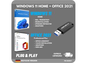 - - Windows 11 Home + Microsoft Office 2021 Professional Plus - Ihr Komplett-Paket für Produktivität Leistung!Mit diesem Bundle-Set erhalten Sie Windows 11 Home (inkl. Lizenzkey) und Microsoft Office 2021 Professional Plus(inkl. Lizenzkey)auf einem hochwertigen 32GB USB 3.2 Stick - ideal für Neuinstallationen, Upgrades und Systemreparaturen. Dieses Set bietet Ihnen eine schnelle, sichere und einfache Lösung.Windows 11 HOME 64bit - Das leistungsstarke Betriebssystem für moderne AnsprücheWindows 11 Home bietet höchste Sicherheit, Geschwindigkeit und Effizienz, sowohl für den geschäftlichen als auch privaten Gebrauch. Original Lizenzschlüssel für die vollständige Aktivierung Neuinstallation oder Reparatur/Upgrade - ideal für neue oder bestehende Systeme Benutzerfreundliches Design optimierte Leistung Ideal für Gaming, Business Home-Office Schritt-für-Schritt-Anleitung für eine einfache InstallationMicrosoft Office 2021 Professional Plus - Die komplette Office-Suite für maximale ProduktivitätMit Office 2021 erhalten Sie alle wichtigen Anwendungen (Word, Excel, Outlook etc.) für Ihre täglichen Aufgaben - perfekt für Arbeit, Studium oder Home-Office. Original Lizenzschlüssel 1-Klick-Installation - einfache schnelle Aktivierung Kein Abo Inklusive Detaillierte InstallationsanleitungPlug Play - Schnelle Installation vom USB-StickDieses Softwarepaket wird auf einem hochwertigen 32GB USB 3.2 Stick geliefert, sodass Sie Ihr System und Office einfach und schnell installieren können: ... Microsoft Office 2019 Professional Plus ist eine kostengünstige Option für professionelle Anwender, die eine ältere, aber funktionsreiche Version bevorzugen. ![]() Lizenzguru .de