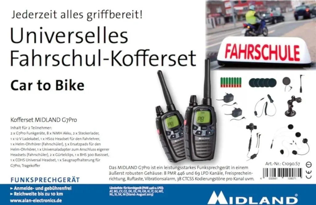 Verfügbarkeit: lieferbar bis Weihnachten-in 2-3 Werktagen bei dir - Kategorie: Funkgeräte - Midland - GTIN:8011869203916 - Maße & Gewicht Breite , 5.80 cm, Gewicht , 120.00 g, Höhe , 12.20 cm, Stromversorgung Reichweite , 10.00 km, Hinweise Warnhinweise , n/a, Technische Daten WEEE-Reg.-Nr. DE , 96735569, - 181,51 Euro bei OTTO - gefunden von billiger.de Ein weiteres Fahrschulkofferset, das eine kostengünstigere Alternative für die Fahrschulausbildung bietet. ![]() ![]() Midland Fahrschulkoffer G7 Pro C1090.S7 PMR/LPD-Handfunkgerät
