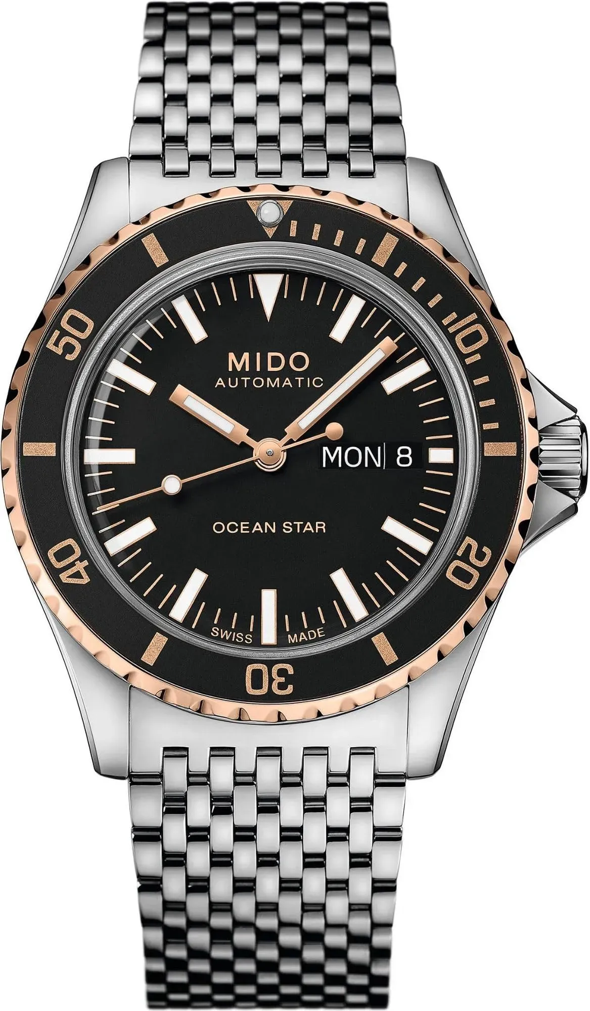 Verfügbarkeit: Gewöhnlich versandfertig in 2 bis 3 Tagen - Kategorie: Herrenuhren - Mido - GTIN:7612330136095 - Uhrwerk: automatisches Mido-Kaliber - Gangreserve 80 Stunden Gehäusetyp: Edelstahl €“ durchsichtiger Gehäuseboden Gehäusegröße: 40 mm, Armbandbreite: 20 mm, Gehäusestärke: 10,38 mm Kristall: Saphirglas mit doppelseitiger Antireflexionsbehandlung Armband:Leder - Faltschließe - 1010,00 Euro bei Amazon Marketplace Watches - gefunden von billiger.de Die Ocean Star Tribute kombiniert ein klassisches Taucheruhren-Design mit rosévergoldeten Akzenten und einem Edelstahlarmband. ![]() ![]() MIDO Ocean Star Tribute €“ Schweizer Automatikuhr für Herren €“ schwarzes Zifferblatt €“ 40,5 mm Edelstahlgehäuse €“ Schwarze Lünette mit roségoldener PVD-Beschichtung €“ Edelstahlarmband €“ M0268302105100