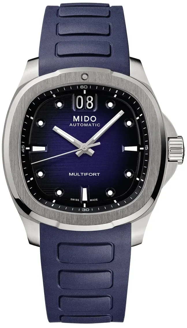 Verfügbarkeit: Gewöhnlich versandfertig in 2 bis 3 Tagen - Kategorie: Herrenuhren - Mido - GTIN:7612330139812 - Schweizer Uhr Uhrwerk: Das MIDO Caliber 80 stellt einen großen Fortschritt bei selbstaufziehenden Uhrwerken dar. Dank seiner neuen Generation Technologie bietet sie bis zu 80 Stunden Gangreserve Gehäusetyp: Edelstahl mit roségoldener PVD-Beschichtung, hält Drücken von bis zu 20 bar stand und ist mit einer verschraubten Krone ausgestattet Gehäusegröße: 40,5 mm, Gehäusestärke: 13,4 mm, schwarzes Zifferblatt mit Tag, Datum, Kalender, schwarze Lünette mit roségoldener PVD-Beschichtung, Kristall: Saphirglas Bandtyp: 11-gliedriges Edelstahlarmband mit Faltschließe und Tauchverlängerung - Bandbreite: 21 mm - 1170,00 Euro bei Amazon Marketplace Watches - gefunden von billiger.de Die Multifort TV Big Date ist ein modernes und auffälliges Modell mit blauem Zifferblatt und Gummiarmband. ![]() ![]() MIDO Multifort TV Big Date €“ Schweizer Automatikuhr für Herren €“ Edelstahl, 40 mm Gehäuse, Blau auf blauem Gummi, Modern