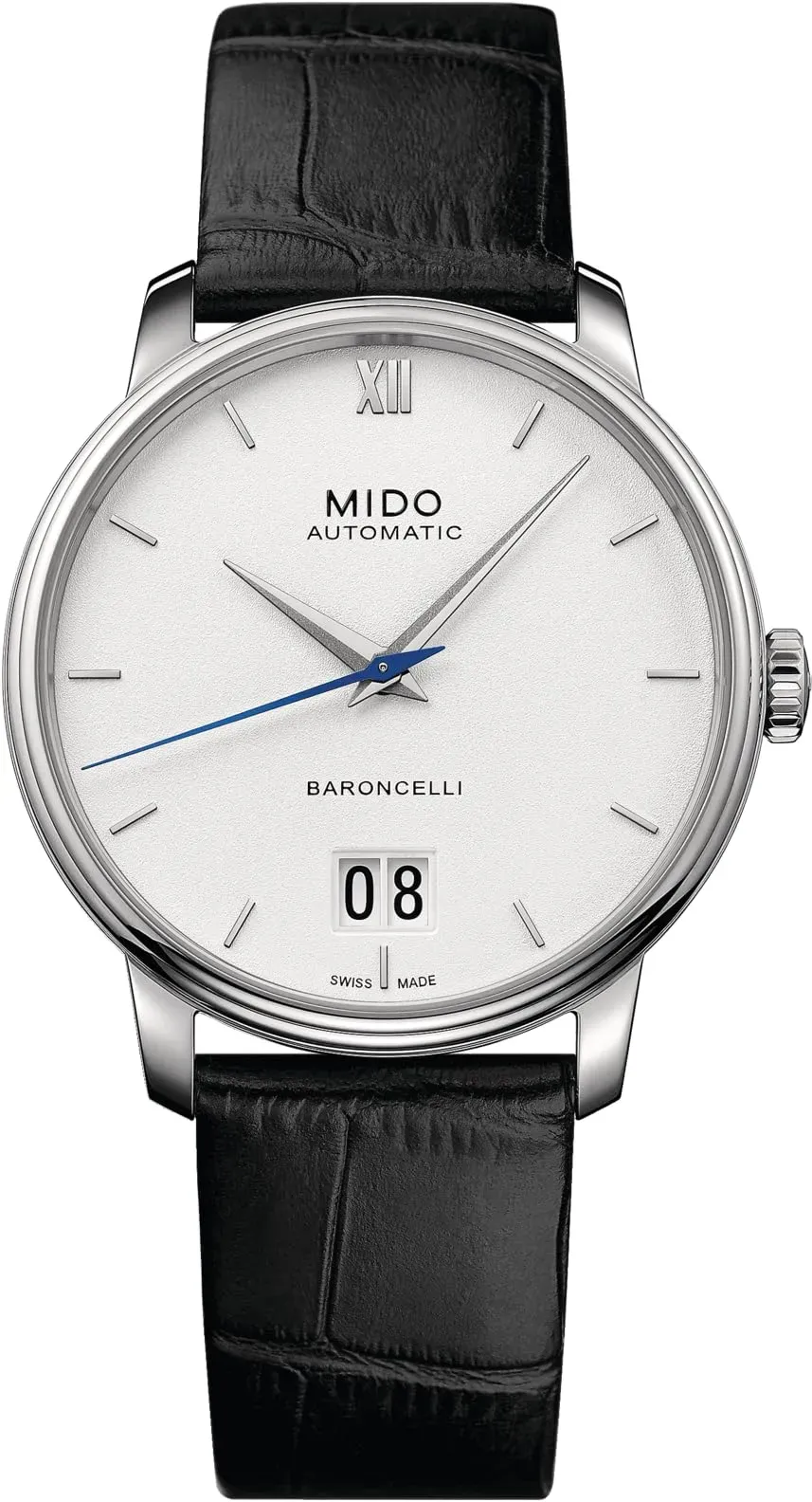 Verfügbarkeit: Gewöhnlich versandfertig in 2 bis 3 Tagen - Kategorie: Herrenuhren - Mido - GTIN:7612330132578 - GEHäUSE - Gehäuse aus: Edelstahl - Form des Gehäuses: Rund - Farbe des Gehäuses: Silber - Glas: Saphirglas, entspiegelt - 980,00 Euro bei Amazon Marketplace Watches - gefunden von billiger.de Die Baroncelli Big Date bietet ein elegantes Design mit großem Datumsfenster und ist ideal für formelle Anlässe. ![]() ![]() MIDO Baroncelli Big Date €“ Schweizer Automatikuhr für Herren €“ weißes Zifferblatt €“ Gehäuse 40 mm €“ M0274261601800