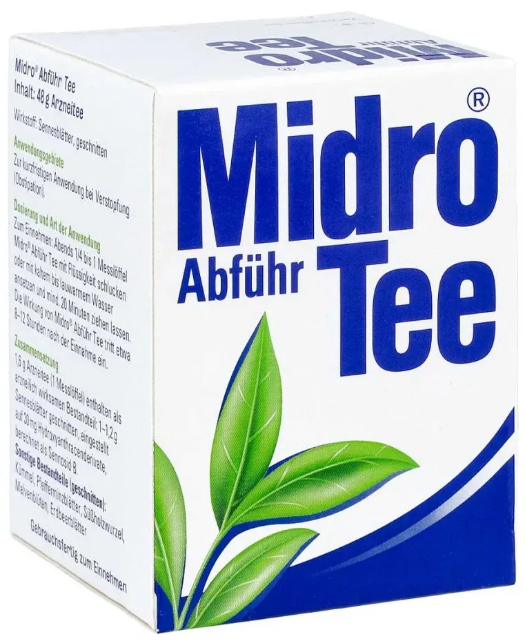 ? Was ist Midro Tee?Midro Tee ist ein Kräutertee, dessen Hauptwirkstoff die Sennesblätter sind. Diese regen die Darmbewegung an und wirken abführend. Zusätzlich enthalten sind Pfefferminze, Kümmel, Süßholzwurzel und Malve, die den Geschmack verbessern und die Wirkung unterstützen.