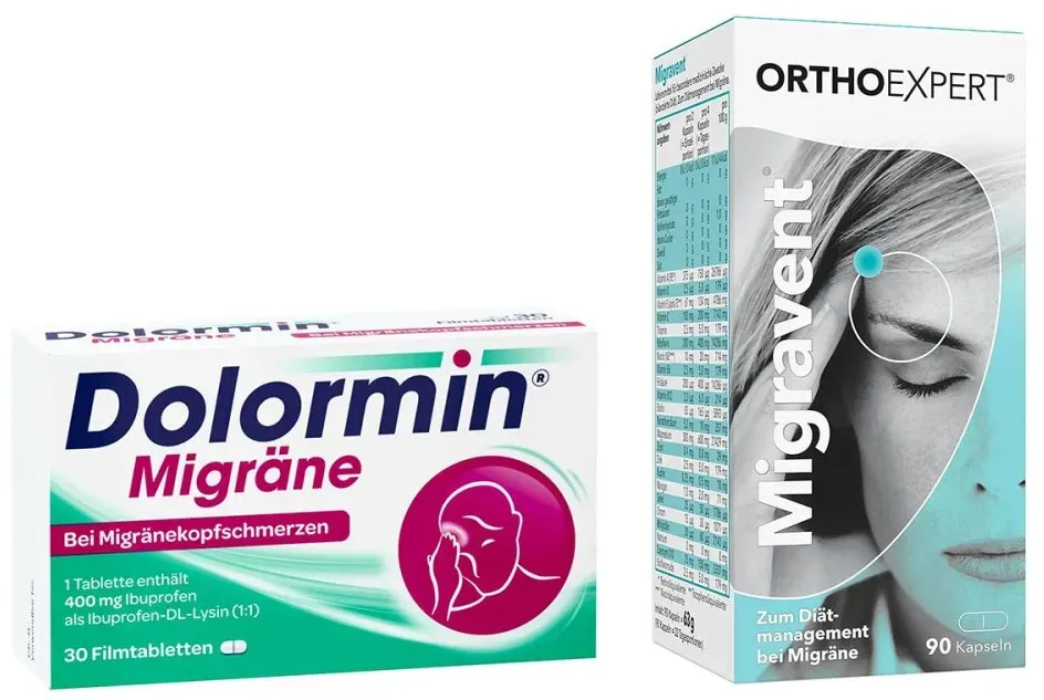 Kategorie: Nahrungsergänzungsmittel - Orthoexpert - GTIN:4150068339942 - HOCHDOSIERTE KOMBINATION: Migravent Classic mit 300mg Magnesium in Form von Magnesiumcitrat & 200mg Riboflavin (Vitamin B2) - zur Unterstützung von Nervensystem & Energiestoffwechsel* - 2x täglich 2 Kapseln FüR STARKE NERVEN: Magnesium & Vitamin B2 tragen zur normalen Funktion des Nervensystems bei* - Magnesium zusätzlich zur Verringerung von Müdigkeit & Ermüdung* - optimal bioverfügbares Magnesiumcitrat WISSENSCHAFTLICH FUNDIERT: Wissenschaftlich fundierte Rezeptur auf Basis ernährungswissenschaftlicher Forschung - Magnesium ist an über 300 Enzymreaktionen beteiligt & wichtig für Nerven- & Muskelfunktion* PREMIUM VERTRäGLICHKEIT: Migravent Classic ist vegan, gluten- & laktosefrei - hergestellt in Deutschland in Apothekenqualität DURCHDACHTE ALTERNATIVE: Migravent classic ist ein reines Nahrungsergänzungsmittel mit einer bewährten Kombination aus besonders gut resorbierbarem Magnesiumcitrat & hochdosiertem Vitamin B2* - 29,95 Euro bei Amazon Marketplace Health & Personal Care - gefunden von billiger.de Dieses Angebot ist mit 34.69 Euro das günstigste Kombipaket mit Migravent Kapseln und Dolormin Migräne Filmtabletten. ![]() ![]() Migravent Kapseln + Dolormin Migräne Filmtabletten
