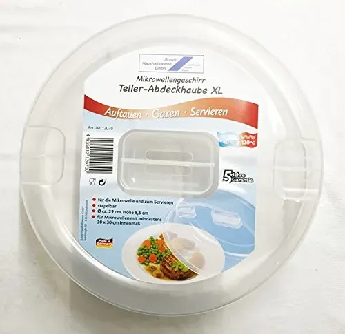 Sonstige Küchenhelfer u. -werkzeuge - EAN:4047443288059 - Nützliches Zubehör für Ihre Küche: die xavax R Mikrowellenhaube M-Capo transparent, 1 St.Unverzichtbar für den Mikrowellengebrauch ist die xavax R Mikrowellenhaube M-Capo transparent, 1 St.. So wird Ihr Gerät vor unschönen Spritzern von dem zu erwärmenden Essen geschützt. Weiterer Vorteil: Die Speisen werden dank dank des zirkulierenden Wasserdampfes gleichmäßig warm und trocknen zudem nicht so schnell aus.Hochwertige und langlebige KomponentenBestehend aus Kunststoff ist das Exemplar nicht nur robust und funktional, sondern punktet auch durch seine Optik und das geringe Gewicht.Noch mehr interessante DatenSie erhalten die xavax R Mikrowellenhaube M-Capo mit einem Durchmesser von 26,0 cm und einer Höhe von 10,3 cm. Die Farbe ist transparent.Mit diesen Besonderheiten punktet die xavax R Mikrowellenhaube M-CapoSie suchen nach besonderen Eigenschaften? Das bietet das Produkt:bruchsicherlebensmittelechtTemperaturbereich: -30 °C bis +110 °CUnkompliziert in der Spülmaschine reinigenDie Reinigung geht dank Spülmaschineneignung besonders einfach. Das ist im Vergleich zum Abwasch per Hand nicht nur weniger zeitaufwändig, sondern insgesamt betrachtet auch wassersparender.Passt dieses Exemplar zu Ihren Bedürfnissen?Bestellen Sie die xavax R Mikrowellenhaube M-Capo transparent, 1 St. ganz bequem hier bei uns im Online-Shop und profitieren Sie von diesem praktischen Utensil! - gefunden von Kelkoo Diese XL-Mikrowellenhaube ist perfekt für größere Teller und Schüsseln. ![]() ![]() Schulz-Haushaltwaren XL Mikrowellenhaube Mikrowellenabdeckhaube Abdeckhaube Mikrowellengeschirr 29 cm