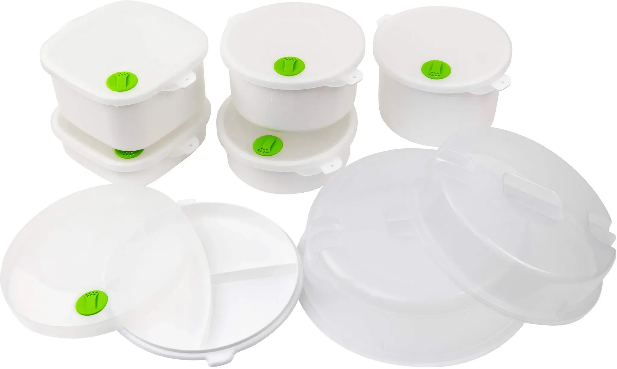 Kategorie: Küchengeräte-Zubehör - Kigima - GTIN:9009690032545 - Perfekter Schutz: Unser Mikrowellen Deckel bewahrt Ihre Mikrowelle vor Spritzern und erleichtert die Reinigung. Ideal zum schonenden Erwärmen von Speisen ohne zusätzliche Mühe endlich Schluss mit lästigem sauber machen der Mikrowelle! Praktisches Set: Unser Set enthält drei extra große Mikrowellendeckel in leuchtenden Farben mit praktischem Entlüftungsventilen. Mit unserem Microwave Cover brauchen Sie sich beim erwärmen von Speisen nie mehr Sorgen um Spritzer machen! Effiziente Dampfregulierung: Dank des cleveren Entlüftungsventils in unserer Mikrowelle Haube kann überschüssiger Dampf einfach entweichen und schützt so, durch optimale Hitzeverteilung in Ihrer Mikrowelle, Ihre Speisen. Praktische Abmessungen: Die Mikrowelle Abdeckhaube misst 29x29x11,5 cm (LxBxH) und bietet so ausreichend Platz für jede Mahlzeit. Unsere farbigen Designs bringen Abwechslung in Ihre Küche. Robust & vielseitig: Unser Mikrowelle Zubehör ist temperaturbeständig von -18 bis +100 C, spülmaschinengeeignet und BPA-frei. Gefrier- und mikrowellengeeignet, NICHT backofengeeignet Material: PP Polypropylen. Made in EU. - 21,99 Euro bei Amazon Marketplace Home - gefunden von billiger.de Dieses umfangreiche Mikrowellengeschirr-Set inklusive zwei Mikrowellenhauben ist vielseitig einsetzbar. ![]() ![]() Grizzly Mikrowellengeschirr-Set mit Dampfventil-Deckeln, 14-teiliges Set, 1x Mikrowellenteller mit Deckel, 5x Mikrowellenschüsseln mit Deckel und 2x Mikrowellenhaube, vom Einfrieren bis Dampfgaren
