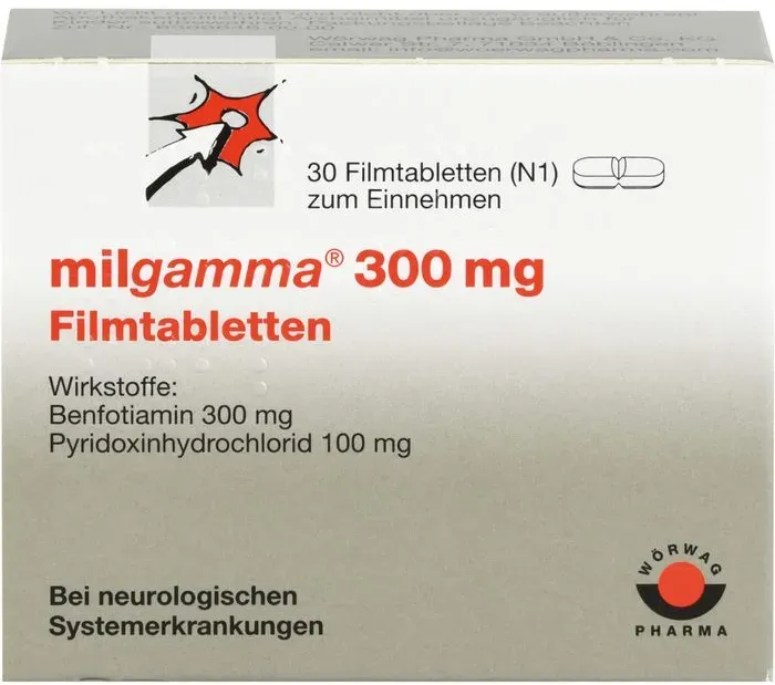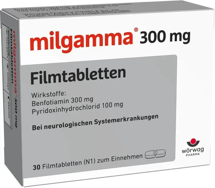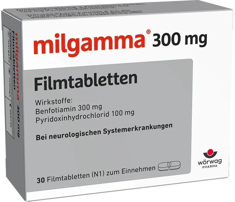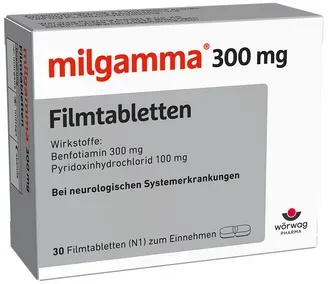 Milgamma - Anwendungsgebiet von Milgamma 300 mg FilmtablettenMilgamma 300 mg Filmtabletten enthält mit Benfotiamin und Vitamin B6 wichtige Nährstoffe für die Nervenzellen. Sie sind für die Umwandlung von Zucker in Energie, sowie für die Funktionsfähigkeit der Nerven unerlässlich und unterstützen den Nerv, sich selbst zu helfen. Die effektive Wirkstoffkombination wirkt der Unterversorgung der Nervenzellen mit diesen Vitaminen entgegen und wird bei der Behandlung neurologischer Systemerkrankungen (Nervenerkrankungen) eingesetzt. milgamma 300 mg Filmtabletten wird angewendet bei neurologischen Systemerkrankungen infolge eines Mangels der Vitamine B1 und B6. Wirkungsweise von Milgamma 300 mg FilmtablettenEin nicht ausreichend eingestellter Diabetes kann zu Folgeerkrankungen wie Gefäß-, Nerven- und Nierenschäden führen. Die Sensibilität und Durchblutung in Ihren Extremitäten nehmen ab. Dieser Prozess verläuft schleichend und wird so nicht immer rechtzeitig bemerkt. Mit Milgamma 300 mg Filmtabletten können Sie sich vor diesen Erkrankungen schützen. Dazu enthalten Milgamma 300 mg Filmtabletten Benfotiamin. Dieses verhindert die Ansammlung von Stoffwechselendprodukten und verhindert so die Schäden. Wirkstoffe / Inhaltsstoffe / Zutaten1 Tablette von Milgamma 300 mg Filmtabletten enthält: Benfotiamin, Pyridoxin hydrochlorid. Weitere Bestandteile von Milgamma 300 mg Filmtabletten: mikrokristalline Cellulose, Cellulosepulver, Maisstärke, Gelatine, Magnesium stearat, Hypromellose, ... Dieses Angebot bietet 30 Tabletten für 25.98 Euro und ist somit eine gute Wahl für den regelmäßigen Gebrauch. ![]() ![]() Wörwag Pharma GmbH & Co.KG Milgamma 300 mg Filmtabletten 30 St 02913880_DBA