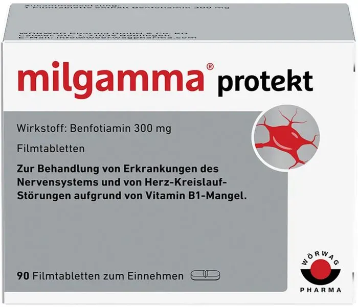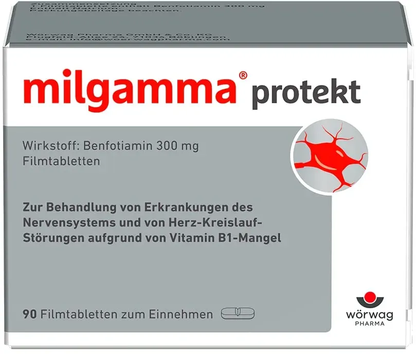 0,60 / 1 St. - Kategorie: Arzneimittel - Wörwag Pharma - GTIN:4150015297318 - PZN:01529731 - MILGAMMA protekt Filmtabletten 90 St. von Wörwag Pharma GmbH & Co. KG (PZN 01529731) günstig kaufen bei Fliegende-Pillen.de - seit über 1 n Ihre Versandapotheke. Günstig, diskret, sicher. - 53,89 Euro bei fliegende-pillen.de - gefunden von billiger.de Amazon Marketplace bietet 90 Tabletten für 55.51 Euro an, was eine bequeme Kaufoption darstellt. ![]() ![]() milgamma protekt, 90 Stück: Mit Benfotiamin zur Behandlung von Symptomen bei Nervenschäden infolge eines Vitamin-B1-Mangels, besonders hohe Bioverfügbarkeit, 1x tägliche Einnahme