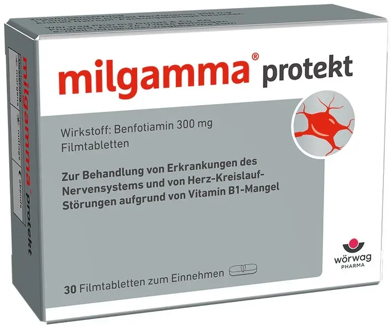 0,56 /St - Kategorie: Arzneimittel - Wörwag Pharma - GTIN:4150015281577 - PZN:01528157 - milgamma protekt mit BenfotiaminZur Behandlung eines Vitamin-B1-Mangels. So können Fußbeschwerden wie Kribbeln, Brennen oder Taubheitsgefühle in ihrer Ursache gelindert werden.Ihre Wahl bei Nervenschäden infolge eines Vitamin-B1-MangelsKribbelnde, brennende oder schmerzende Füße rauben vielen Menschen nachts den Schlaf. Nervenschäden, sogenannte Neuropathien, können dafür eine mögliche Ursache sein. Betroffene wissen oft nicht, dass auch ein Vitamin-B1-Mangel diese Neuropathien auslösen oder verstärken kann. Wer dieses Defizit ausgleicht, kann dadurch seine Beschwerden in den Füßen lindern. Gerade Menschen mit Diabetes können ein erhöhtes Risiko für einen Vitamin-B1-Mangel und Neuropathien haben. Der erhöhte Blutzucker kann die Nerven schädigen und gleichzeitig ein Vitamin-B1-Defizit fördern.Benfotiamin ist das bessere Vitamin B1zur Behandlung des Vitamin-B1-Mangels als mögliche Ursache von Erkrankungen der Nervenfettlösliche Vitamin-B1-Vorstufe mit 5-mal höherer Bioverfügbarkeit als normales Vitamin B11gut verträglichauch für die längerfristige Einnahme geeignetmilgamma protekt kann den Vitamin-B1-Mangel ausgleichen und die Beschwerden lindern. Das Besondere ist der Wirkstoff Benfotiamin. Die fettlösliche Vorstufe von Vitamin B1 wird 5-mal besser vom Körper aufgenommen als einfaches Vitamin B1 (Thiamin). Was viele nicht wissen: Auch ein Vitamin-B1-Mangel kann Nervenschäden verursachen ... Aponeo.de hat 30 Tabletten für 17.80 Euro im Angebot, eine weitere preiswerte Option für eine kleine Packungsgröße. ![]() ![]() milgamma protekt Vitamin B1 Tabletten Filmtabletten Inhalt: 30 St