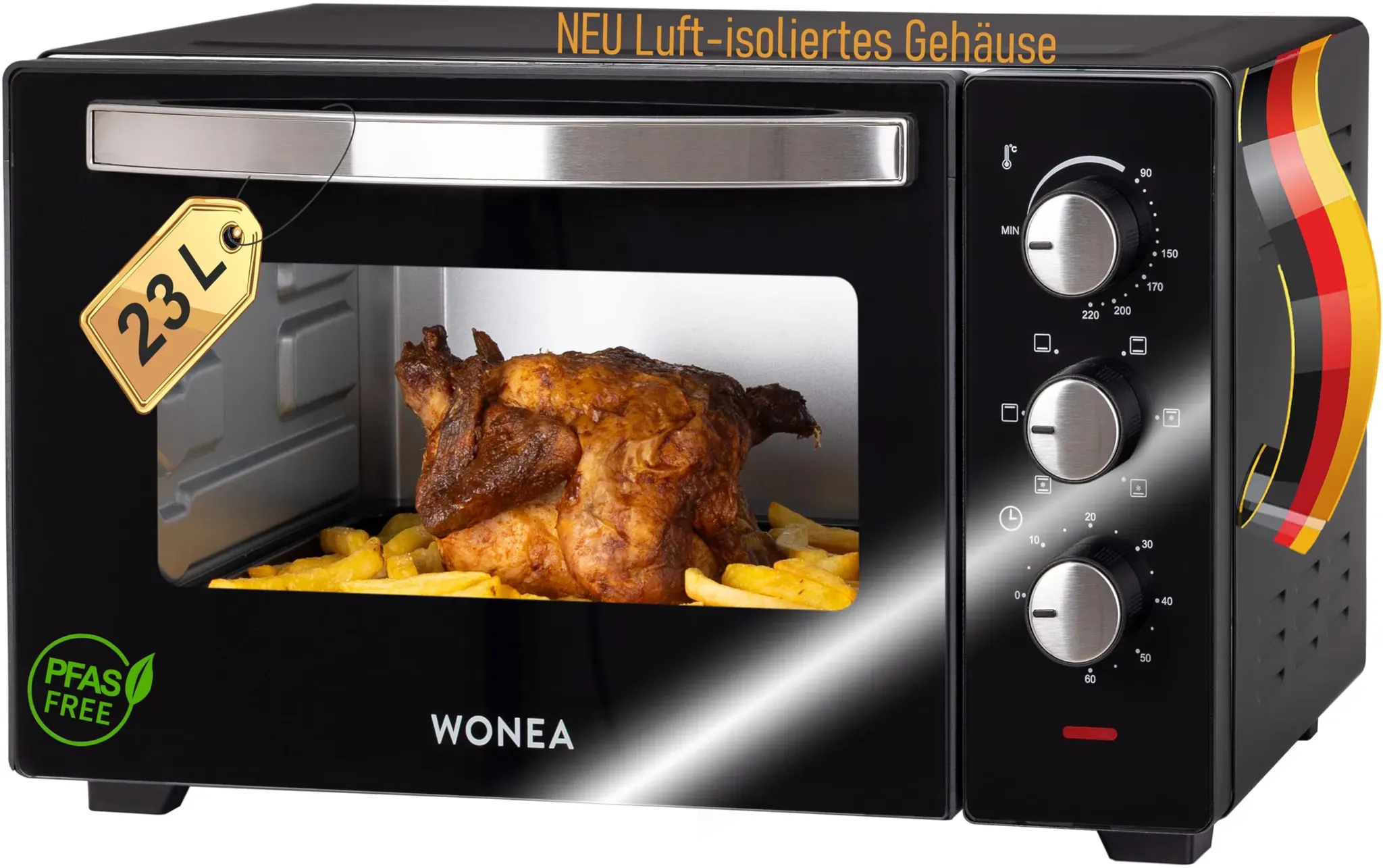 Kategorie: Miniöfen - WONEA - GTIN:4251801600760 - Luft-Isoliertes Gehäuse Das isolierte Gehäuse ist ein Highlight des Minibackofen mit Umluft von WONEA. Hier haben wir uns an dem Prinzip der Hohlraumziegel für Hauswände orientiert, bei diesen wird ebenfalls Luft als Isolierung eingesetzt, um es im Haus schön warm zu halten. Durch die Isolierung wird das Gehäuse außen nicht so heiß und der 23 Liter Minibackofen verbraucht dadurch weniger Energie als vergleichbare Produkte. Kein Plastikkontakt Dieser Mini-Backofen verzichtet komplett auf Plastikkontakt und ist zudem PFAS frei. Für ein gutes Gefühl beim Kochen! Egal ob beim Camping oder in der Ferienwohnung. Glasfront mit Doppelglastür aus Sicherheitsglas Das Bedienpanel und die Backofentür verfügen über ein einheitliches Design aus elegantem Glas, wie bei einem Einbaubackofen. Die doppelt verglaste Backofentür aus hochwertigem Sicherheitsglas ist für weniger Verbrauch und mehr Sicherheit für Ihr Zuhause mit WONEA Haushaltsgeräten ausgelegt. 3 Einschubhöhen - 4 Heizelemente Die drei Einschubhöhen ermöglichen Ihnen den Abstand zu den vier Edelstahl Heizelementen zu variieren. 6 Programme Mit den 3 Drehknöpfen ist der Minibackofen einfach und vielfältig einsetzbar. Ihnen stehen 6 Programme zur Verfügung, welche Sie nach Ihren Bedürfnissen einstellen können. Timer mit automatischer Abschaltung: Dank des bis zu 60 Minuten einstellbaren Timer mit automatischer Abschaltung können Sie entspannt unter die Dusche gehen bis das Essen ... ![]() ![]() Sirge GENNARI - Elektrobackofen 16 eBay Liter, 1400 Watt, 60min Timer, 100 bis 230°C