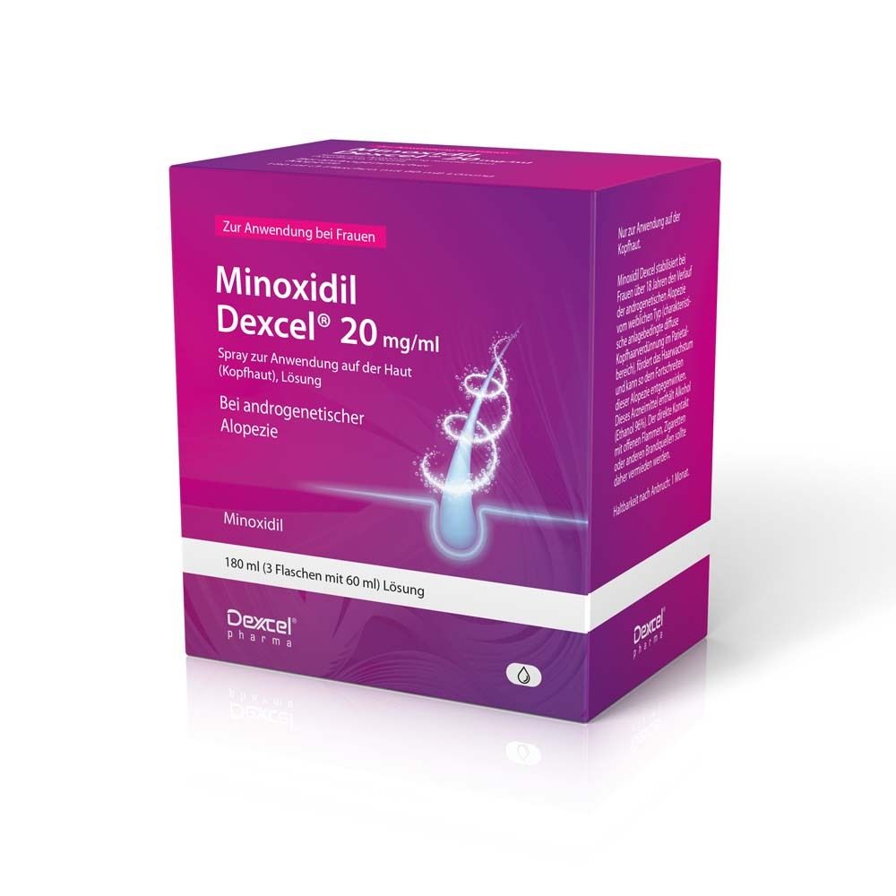 18 Händlerangebote bei billiger.de - Kategorie: Arzneimittel - Dexcel Pharma - Anwendungsgebiet von Minoxidil Dexcel 20 mg/ml Spray für FrauenDas Präparat enthält den Wirkstoff Minoxidil und ist ein Arzneimittel zur Behandlung des Haarausfalls vom weiblichen Typ.Das Präparat stabilisiert bei Frauen über 1 n den Verlauf des anlagebedingten Haarausfalls im Scheitelbereich (androgenetische Alopezie vom weiblichen Typ). Die Behandlung mit diesem Präparat fördert das Haarwachstum und kann so dem Fortschreiten dieses Haarverlustes entgegenwirken.Der Beginn des Haarausfalls vom weiblichen Typ ist gekennzeichnet durch eine Verminderung der Haardichte im Bereich des Scheitels und der vorderen Kopfhaut bei Erhalt des Haaransatzes. Es kommt fast nie zur völligen Kahlheit, sondern zur diffusen Ausdünnung der Haare im Mittelscheitelbereich.Für mehr Informationen, s. Gebrauchsinformation.Wenn Sie sich nach 8 Monaten nicht besser oder gar schlechter fühlen, wenden Sie sich an Ihren Arzt.Wirkstoffe / Inhaltsstoffe / Zutaten20 mg Minoxidil564 mg Ethanol 96% (V/V) Hilfstoff (+)104 mg Propylenglycol Hilfstoff (+)Wasser, gereinigt Hilfstoff (+)GegenanzeigenDas Präparat darf nicht angewendet werden, wenn Sieallergisch gegen Minoxidil oder einen der sonstigen Bestandteile dieses Arzneimittels sind.andere Arzneimittel auf der Kopfhaut anwenden.an plötzlich auftretendem oder ungleichmäßigem Haarausfall leiden.schwanger sind.Ihr Kind stillen.DosierungWenden Sie dieses Arzneimittel immer genau wie ... Ein preiswertes Einzelprodukt für Männer, um Minoxidil-Spray zu testen. ![]() ![]() Dexcel Pharma Minoxidil Dexcel 50 mg/ml Spray 60 ml