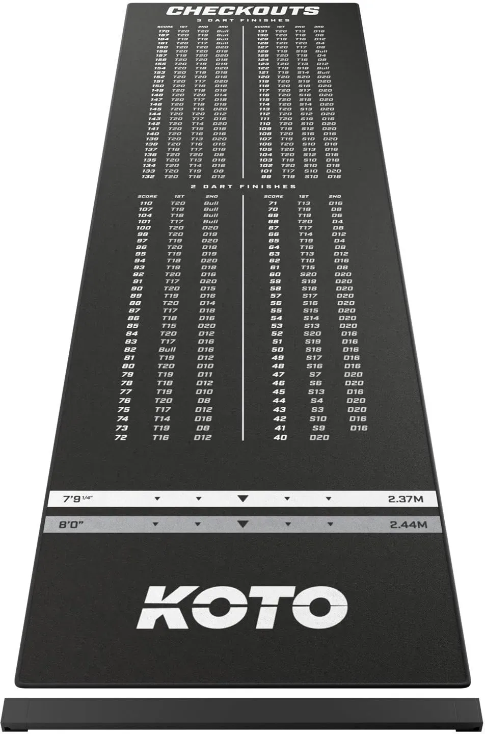 Zustand: Neu - Kategorien Sonstiges - Studio M - Parent - EAN: 5407009083235 - œ FÜR ZUHAUSE UND TURNIERE - Diese Premium Dartmatte ist ideal für ambitionierte Hobbyspieler und professionelle Dartliebhaber. Ob im Wohnzimmer oder im Vereinsraum - die Matte bringt Turnierfeeling direkt zu Ihnen nach Hause und passt perfekt unter jede Dartscheibe. œ OFFIZIELLE ABWURFLINIE 237CM - Dank der integrierten Oche-Linie bei exakt 237 cm Abstand zur Dartscheibe legen Sie die korrekte Wurfentfernung spielend fest. Die weiche Bodenschutzmatte schont dabei sowohl Ihren Boden als auch herunterfallende Steeldarts. œ INTEGRIERTE CHECKOUT-TABELLE - Die Dartscheibe Matte verfügt über eine praktische Checkout-Tabelle, mit der Sie jederzeit wissen, wie Sie ein Spiel gezielt beenden können. Beispiel: Bei 98 Punkten zeigt Ihnen die Tabelle an, dass Sie mit Triple 20 und Double 19 auschecken können. Ideal für ein strategisches Finish - ganz ohne Rechnen während des Spiels. œ RUTSCHFEST UND ROBUST - Die Rückseite der Premium Dartmatte ist mit einer Anti-Rutsch-Beschichtung versehen, die sicheren Halt auf allen Bodenarten bietet. Die Oberfläche aus langlebigem Nylon überzeugt durch Strapazierfähigkeit und ein angenehmes Laufgefühl. œ LEICHT ZU REINIGEN - Pflegeleicht und praktisch: Diese Bodenschutzmatte kann ganz einfach mit dem Staubsauger gereinigt werden. So bleibt Ihre Dart-Ecke stets sauber und bereit für das nächste Spiel. - Verkäufer: ACAZA im amazon.de Marketplace Ein umfassender Dartteppich, der nicht nur die Abwurflinie, sondern auch Score-Indikationen bietet. ![]() ![]() KOTO darts KOTO - Dartteppich Oche Carpet Checkout 285 x 80 cm Dartmatte zum Schutz des Bodens & der Dartpfeile, Mit Score-Indikation & Oche