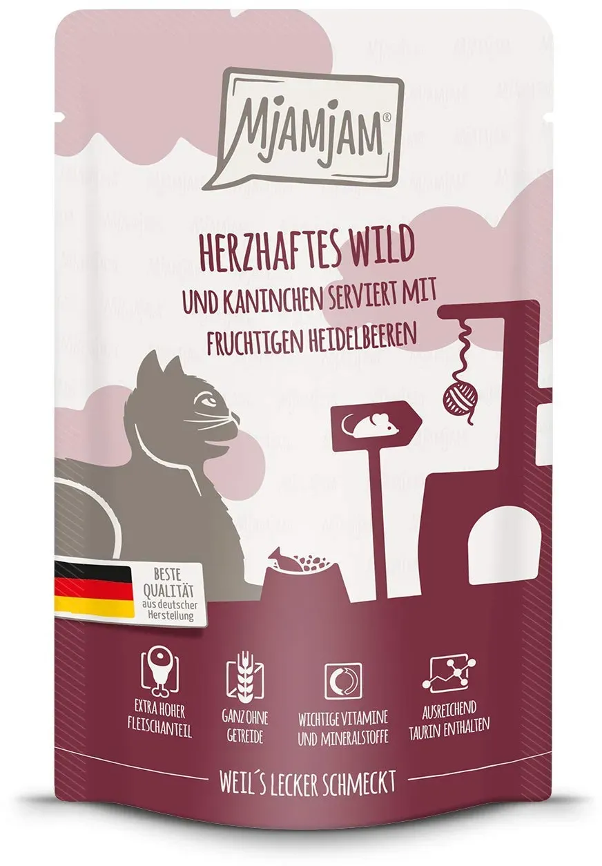 EUR5.41 / 1kg - Lebensmittel Katzenfutter & Zubehör Katzenfutter nass MjAMjAM Adult Haustierzubehör - EAN:4260512870065 - Sie suchen nach etwas Besonderem für den Futternapf Ihres Schmusetigers? MjAMjAM ist eine hervorragende Wahl, wenn es um köstliches Nassfutter geht, das auch den Ansprüchen wählerischer Samtpfoten gerecht wird. Das Futter für ausgewachsene Katzen wird mit sorgfältig ausgewählten Zutaten in bester Qualität zubereitet. Mit MjAMjAM erhalten Sie Katzenfutter aus hochwertigen Zutaten, die zum Großteil von regionalen Bauernhöfen stammen. Das Futter kommt ohne Getreide und Zuckerzusatz aus. Es enthält neben viel Fleisch weitere tierische sowie pflanzliche Zutaten, die als Lieferanten für wertvolle Vitalstoffe dienen. MjAMjAM 6 x 400 g im Überblick: Beutenahes Nassfutter für ausgewachsene Katzen Sehr schmackhaft: wird von vielen Katzen gut angenommen Hoher Anteil von Fleisch: passt gut in eine fleischreiche, artgerechte und naturnahe Ernährung Angereichert mit weiteren Zutaten: enthält je nach Sorte verschiedene pflanzliche und tierische Extras als Lieferanten für Vitamine und Mineralstoffe Frei von Getreide und Gluten: für Katzen mit entsprechenden Allergien und Unverträglichkeiten geeignet Erlesene Zutaten: überwiegend von regionalen Bauernhöfen Ohne künstliche Bindemittel, Zucker, Geschmacks- und Konservierungsstoffe Schonende Zubereitung: sanft dampfgegart zum Erhalt der Nährstoffe und Aromen Köstliche Vielfalt: verschiedene Sorten erhältlich Hohe Qualität ... Ein Mixpack ist ideal, um verschiedene Geschmacksrichtungen auszuprobieren und Abwechslung in den Speiseplan der Katze zu bringen. Zooplus.de 6x400g Mixpack MjAMjAM Mix 2 (6 Sorten) Katzenfutter nass