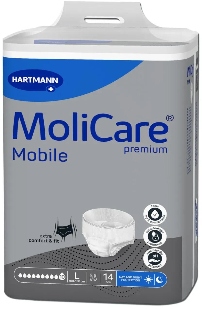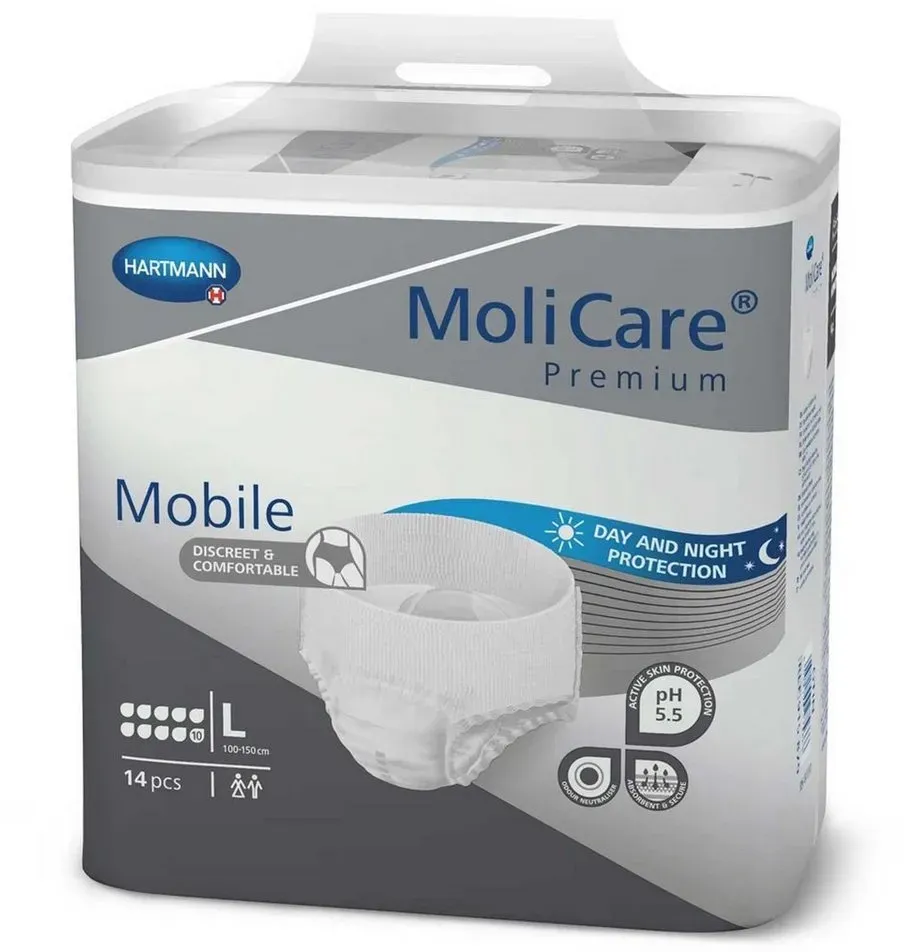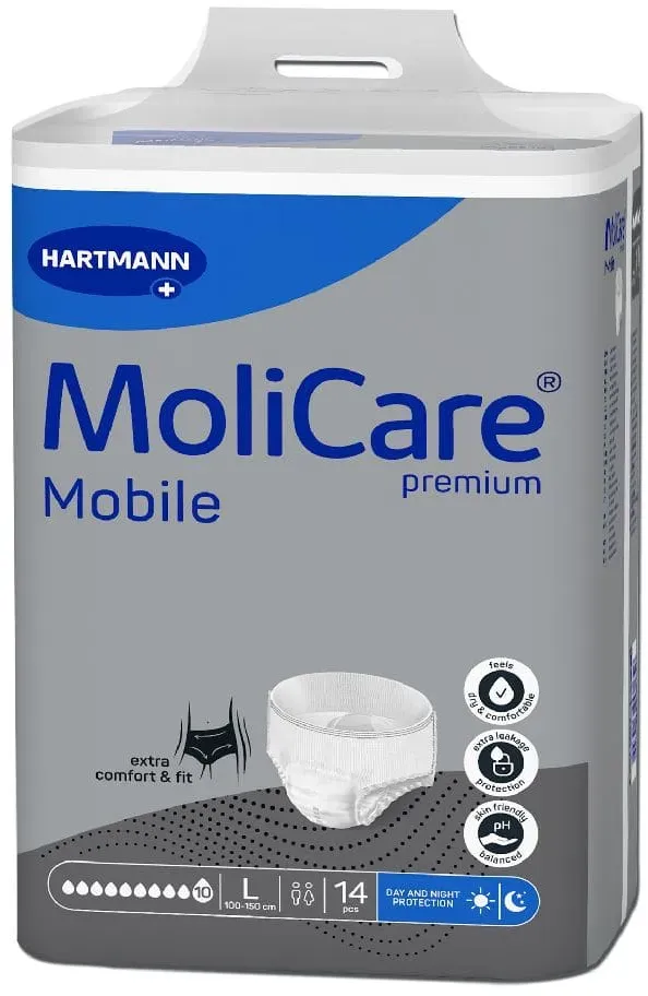 1,14 / 1 Stück - Kategorie: Inkontinenz - Hartmann - GTIN:4052199315799 - MoliCare Premium Mobile 10 Tropfen Atmungsaktive Einweghose für schwerste Inkontinenz MoliCare Premium Mobile Produkte Die MoliCare Premium Mobile Produktreihe bietet umfassenden Schutz und hohen Tragekomfort für Menschen mit mittlerer bis schwerer Inkontinenz. Diese Einweghosen sind sowohl für Männer als auch für Frauen geeignet und bieten eine optimale Lösung für den täglichen Gebrauch. Sie lassen sich wie normale Unterwäsche an- und ausziehen und bieten durch ihre elastische Passform eine bequeme und diskrete Lösung für ein aktives und selbstständiges Leben. Zuverlässiger Schutz bei schwerster Harninkontinenz Die MoliCare Premium Mobile 10 Tropfen sind speziell entwickelt, um Menschen mit schwerer Harninkontinenz einen sicheren Schutz zu bieten. Diese Pants sind ideal für den Tag und die Nacht, da das absorbierende Material und die integrierten Innenbündchen einen bis zu zwölf Stunden langanhaltenden Auslaufschutz gewährleisten. Sie können wie normale Unterwäsche getragen werden, was sie zu einer idealen Lösung für den täglichen Gebrauch macht. Extra diskret und komfortabel Die MoliCare Premium Mobile 10 Tropfen zeichnen sich durch eine Vielzahl technischer Merkmale aus, die den Tragekomfort und die Sicherheit erhöhen. Der hochsaugfähige Kern mit Superabsorber und die Quick-Dry Verteilerauflage sorgen für eine schnelle Aufnahme und Verteilung der Flüssigkeit, während der geruchsbindende Saugkern ... Dieses Angebot von reinigungsberater.de ist mit 18.08 Euro ebenfalls sehr günstig für eine Packung mit 14 Stück. ![]() ![]() Paul Hartmann AG Molicare Premium Mobile 10 Tropfen L 14 Stück PZN 13476980 14 Stück, ehemals Molicare Mobile Super 9158791