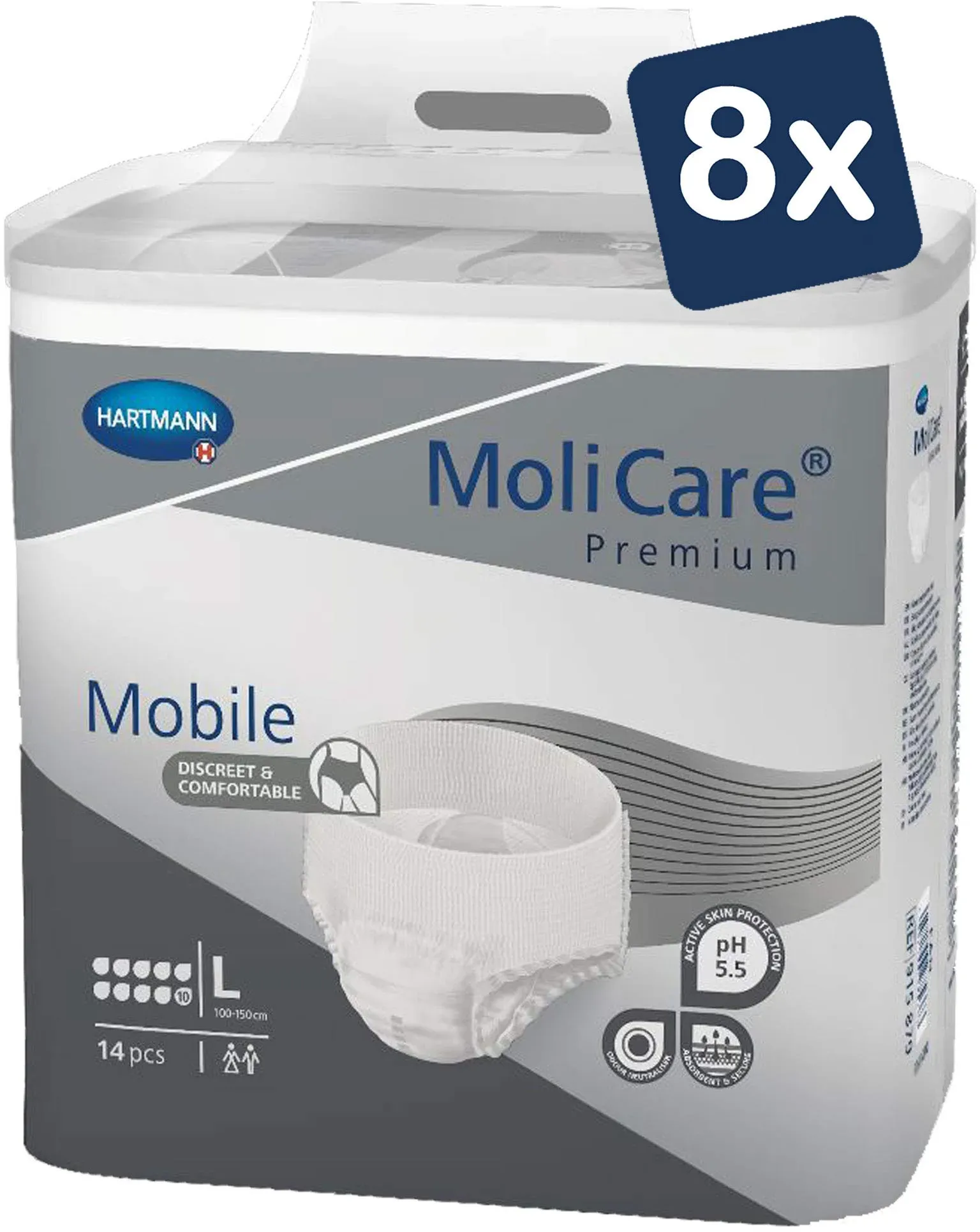 EAN: 4052199275666 - MoliCare Premium Mobile 10 Tropfen ist die besonders saug- starke Einweghose für höchste Ansprüche an Sicherheit bei schwerster Harninkontinenz. Sie lässt sich wie Unterwäsche tragen und ist insbesondere für die Nacht geeignet. Anatomisch geformt, für mehr Tragekomfort Körpernaher Sitz und für ein sicheres Gefühl Nässeindikator zeigt ein notwendiges Wechseln an Aufreißbare Seitennähte erleichtern das Ausziehen ein Optimaler Schutz vor Rücknässung Ultra-Saugkern bindet Gerüche Schutz durch flüssigkeitsundurchlässiges Außenmaterial Weiche, nässeabweisende Beinbündchen für mehr Komfort PZN: 13476980 Wenn nicht -sofort lieferbar- ist die Lieferzeit 5-10 Tage. Pharmazentralnummer (PZN Nummer): 13476980 - bei reinigungsberater.de - aus Yadore Produktdaten Mit 18.08 Euro ist dieses Angebot von billiger.de eine preiswerte Option für eine Einzelpackung. ![]() ![]() Hartmann MoliCare Premium Mobile L 14 St.