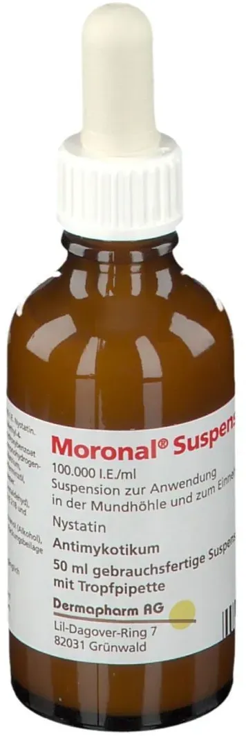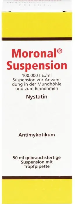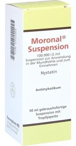 EAN: 4250297401783 - Moronal Suspension Wirkstoffe: Nystatin 100.000 I.E./ml Anwendung: Zur lokalen Behandlung des Mundsoors und zur Verminderung des Hefereservoirs des Darmes (,,Darmsanierung ) bei Hefebefall. Besonders geeignet für Säuglinge, Kleinkinder und schluckbehinderte Patienten. - bei die-beraterapotheke.de - aus Yadore Produktdaten ![]() ![]() MORONAL Suspension 50 ml