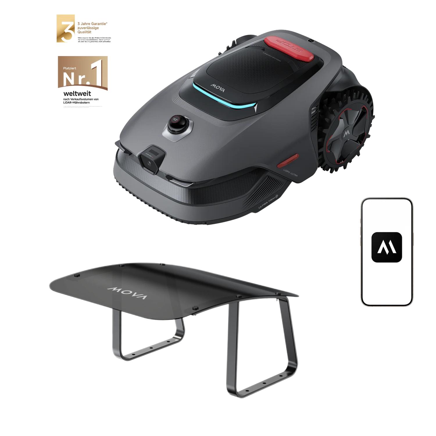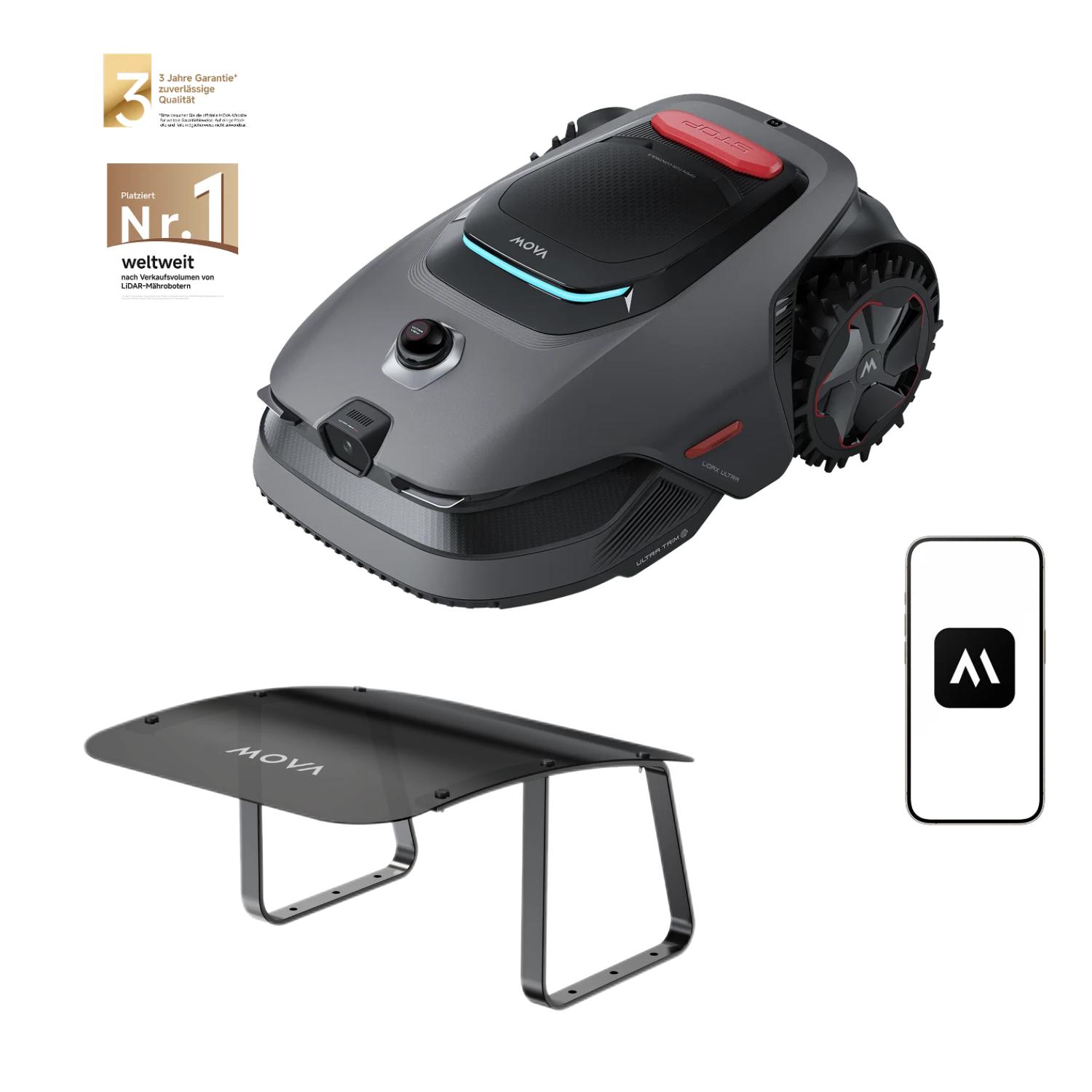 Kategorie: Rasenmäher - Mova - GTIN:6977973410621 - MOVA LiDAX Ultra 800 Mähroboter Erleben Sie mit dem MOVA LiDAX Ultra 800 inteligentes, kabelloses Rasenmähen. Die Sensortechnologie UltraViewTM 2.0 zur Umgebungserfassung ermöglicht mit 3D LiDAR und Al Vision zentimetergenaues Navigieren - ohne Begrenzungskabel und RTK. UltraTrimTM 1.0 sorgt für makelloses Randmähen, die intelligente Hindernisvermeidung und der Tierschutzmodus für ein sicheres Fahren. Der Mähroboter bewältigt schmale Passagen und unebenes Gelände und überzeugt Tag für Tag vollkommen autonom mit zuverlässiger Leistung - präzise, sicher, perfekt. Ohne Kabel & RTK - Automatische Kartierung mit KI AI Vision und 3D LiDAR erstellen ganz ohne Kabel und RTK-Stationen automatisch eine zentimetergenaue 3D-Karte Ihres Gartens - auch bei komplexen Grundrissen und schlechtem oder grellem Licht. Einfach einschalten und mähen lassen. Saubere Kanten - um 5 cm bewegliche Messerscheibe Dank UltraTrim 1.0 mäht der Roboter bis auf 5 cm an Wänden, Hecken und erhöhten Kanten entlang. Durch das Verschieben der Messerscheibe werden nicht abgedeckte Stellen gemäht. Der Roboter befährt Wegränder und sorgt so für saubere übergänge. Verlässliche Sicherheit für Familie & Eigentum Durch UltraView 2.0 erkennt der Mähroboter über 300 selbst kleine Hindernisse und schützt so Kinder und Haustiere. Mit Link-Modul zum Diebstahlschutz profitieren Sie vom Echtzeit-Tracking und Sofortalarm, wenn das Gerät den Kontrollbereich verlässt. ... Ein Standardmodell für 800 m² ohne Begrenzungskabel, direkt über Amazon erhältlich. ![]() ![]() MOVA LiDAX Ultra 800 Mähroboter ohne Begrenzungskabel, Empf. 800 m², ohne RTK & automatische Kartenerstellung per 3D-LiDAR mit 360° & AI Vision, 5 cm Kantenschnitt, effiziente Wegeplanung in U-Form