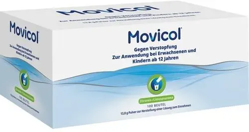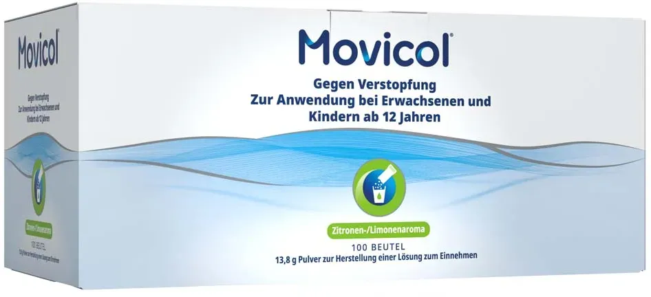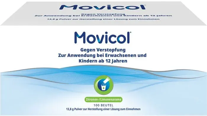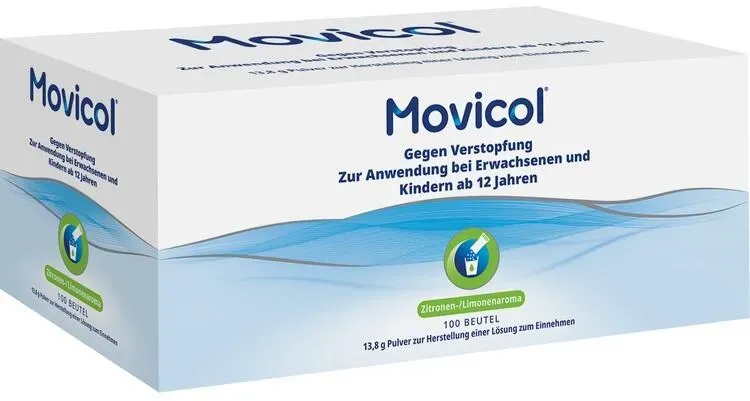 MOVICOL - EAN: 4150075488824 - MOVICOL , Pulver zur Herstellung einer Lösung zum Einnehmen.Zusammensetzung: 1 Beutel (13,81 g) enthält: Macrogol (PEG) 3350 13,125 g, Natriumchlorid 0,351 g, Natriumhydrogencarbonat 0,179 g, Kaliumchlorid 0,047 g.Sonstige Bestandteile: Acesulfam-Kalium, Zitronen-/Limonenaroma.Anwendungsgebiete: Chronische Verstopfung.Was Sie bei der Anwendung von MOVICOL beachten solltenMOVICOL ist zur Anwendung bei chronischer Verstopfung bestimmt und in Beuteln 13,81 Pulver erhältlich. An arzneilich wirksamen Bestandteilen enthält das Pulver Macrogol (Polyethylenglykol) 3350, Natriumchlorid, Natriumhydrogencarbonat und Kaliumchlorid.Erwachsene, Jugendliche und ältere Patienten nehmen je nach Schwere der Verstopfung ein- bis dreimal täglich einen Beutel. In der langfristigen Anwendung kann die Dosis auf ein- bis zweimal täglich einen Beutel reduziert werden.Für Kinder (unter zwölf Jahren) stehen andere Dosierungs- und Darreichungsformen zur Verfügung.Bei Patienten mit Funktionsstörung der Niere (Niereninsuffizienz) sind keine Dosisänderungen nötig. Wie sollten Sie MOVICOL anwenden?öffnen Sie den Beutel und geben Sie das Pulver in ein Glas Wasser (125 ml). Rühren Sie die Flüssigkeit so lange, bis Sie eine klare Lösung erhalten und trinken Sie diese anschließend.Der Zeitraum für eine Behandlung mit MOVICOL sollte normalerweise zwei Wochen nicht überschreiten. Bei Bedarf kann MOVICOL jedoch wiederholt eingesetzt werden. Langfristige AnwendungWie bei allen ... ![]() Movicol Beutel Plv.z.Her.e.Lsg.z.Einnehmen 100 St Pulver zur Herstellung einer Lösung zum Einnehmen