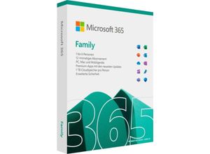 Software Lifestyle Technik Computer - - Microsoft 365 FamilyMit Microsoft 365 Family viele Vorteile genießenMicrosoft 365 bietet alles, was Sie zur Organisation Ihres Lebens benötigen. Zu Hause oder unterwegs sind Sie mit den neuesten Office-Apps und Funktionen auf jedem Gerät immer auf dem Laufenden.Mit 1 TB Cloud-Speicher pro Person haben Sie und Ihre Familie viel Platz für wichtige Fotos, die Sie mit Familie und Freunden teilen können.Einem Fehler begegnet? Kein Problem! Wir bieten Ihnen technischen Support ohne Aufpreis.Microsoft 365 hilft Ihnen dabei, Ihren Tag ins Gleichgewicht zu bringen, sodass Sie Ihre Zeit und Energie auf die Dinge fokussieren können, die am wichtigsten sind.Multitasking leichter gemachtVerwalten Sie Ihre Nachrichten, Kalender und Aufgabenlisten ganz einfach mit Outlook in Microsoft 365. Es ist wie eine Kommandozentrale für das Leben.Schreiben Sie mit Stil und SelbstvertrauenErweiterte Schreibhilfe in einer Vielzahl von Sprachen verfügbar. Microsoft Editor* hilft Ihnen, klar und prägnant zu schreiben, wo immer Sie am meisten schreiben.* Funktionen variieren je nach Sprache, Plattform und AppSchützen Sie Ihre digitale WeltWordExcelPowerpointOutlookOneDriveOneNoteEditorFamily Safety-Smartphone VorteileOffice-Apps auf allen GerätenNeueste Updates und Features1 TB Cloud-Speicher pro PersonKostenfreier technischer SupportKreative Inhalte: Vorlagen, Fotos und SchriftartenKI-gestützte Tools: Design- und SchreibvorschlägeErweiterte Sicherheit Ihrer ... ![]() ![]() MS Office - 365 Family eBay PKC - 12 Monate Laufzeit - Windows - MAC OS X - Box Ware