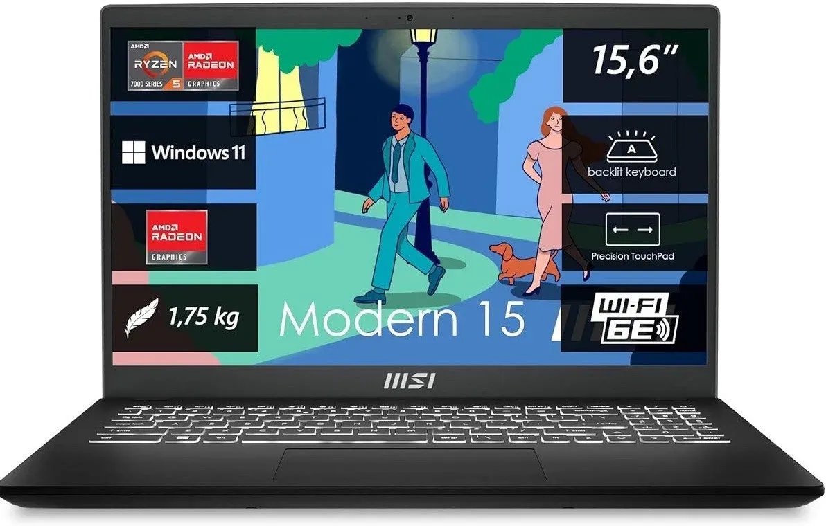 Auf Lager Versand durch AmazonMSI Modern 15 Lifestyle & Business Laptop, 15,6 Zoll Full HD Display, AMD Ryzen 5 7530U Prozessor, 16 GB DDR4 RAM, 512GB SSD, AMD Radeon Graphics, Windows 11 Home, Schwarz, B7M-284