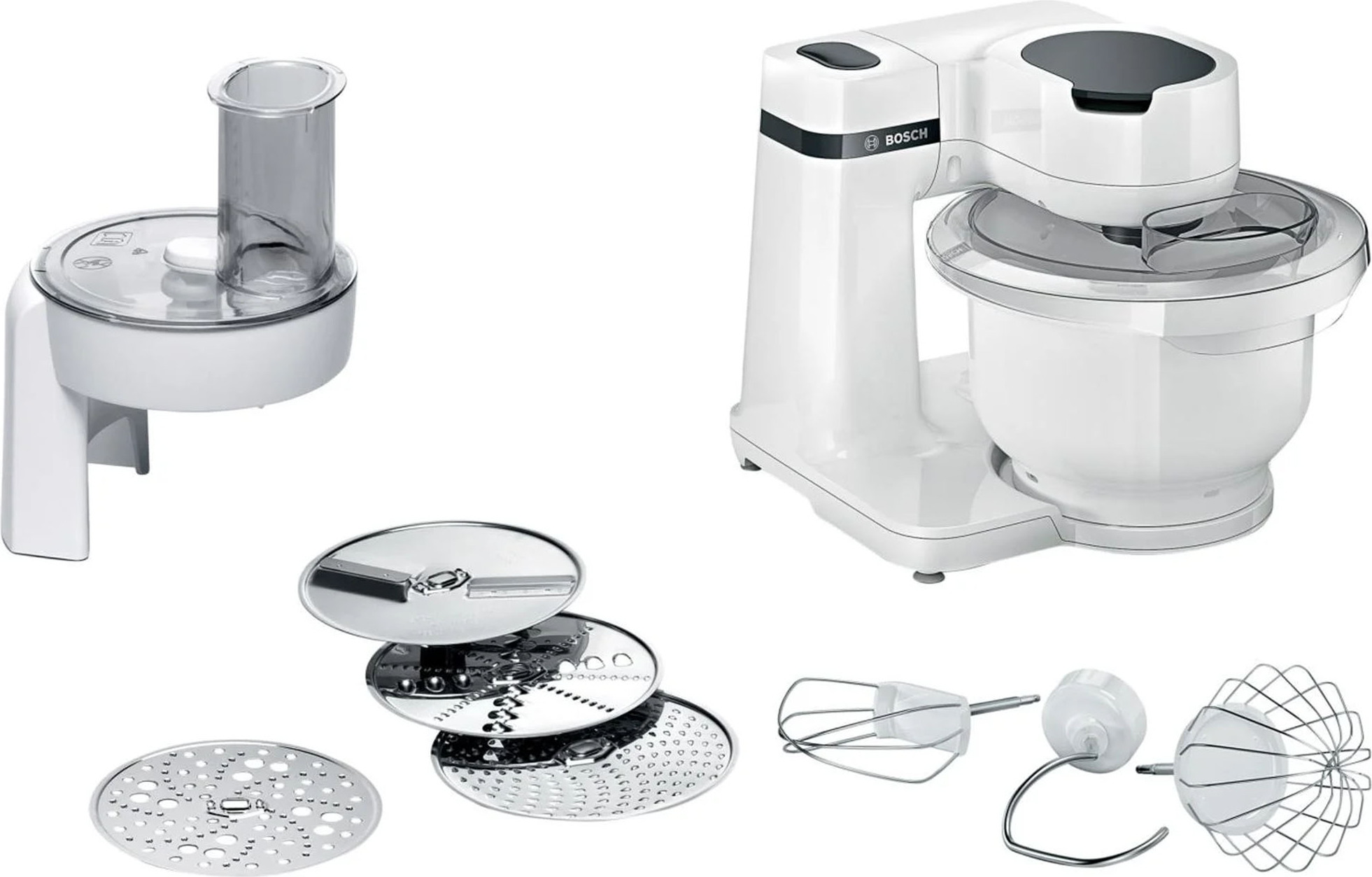 Auf Lager Versand durch AmazonBosch Küchenmaschine Serie 2, kleine Küchenmaschine, 3,8l Kunststoff-Schüssel, Durchlaufschnitzler, 4 Scheiben, 4 Stufen, Knethaken/Rührbesen/Schlagbesen, spülmaschinenfest, 700 W, weiß, MUMS2AW01