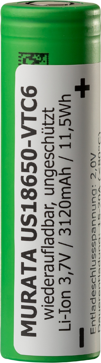 EAN: 4060711180824 - 2 Sony / Murata Konion US18650VTC6 3000mAh - 30ADie dc-akku.de Murata (ehem. Sony Konion) VTC6 Akkuzelle ist eine leistungsstarke und bedingt hochstromfeste Akkuzelle und weiß mit 3120mAh und max. 30A ( 80 C Zellentemperatur) zu überzeugen. Wer mehr zu der Leistungsfähigkeit dieser Zellen wissen möchte, kann sich unter Dampfakkus und bei MOOCHnäher informieren.Technische Daten im GesamtüberblickMax. Kapazität: 3120mAhMin. Kapazität: 2800mAhNennspannung: 3,6 - 3,7 VoltLadeschlussspannung: 4,2V 0,05 VoltEntladeschlussspannung: 2,0 Voltmöglicher Ladestrom: 0,25 - 2,5 AmpereMax. Ladestrom kurzzeitig: 4 AmpereMax. kontinuierliche Stromabgabe: 15A ( 80 C Zellentemperatur)Max. kurzzeitige Stromabgabe: 20A ( 80 C Zellentemperatur)Max. kurzzeitige Stromabgabe: 30A ( 80 C Zellentemperatur)*Chemische Zusammensetzung: LiNiMnCoO2Schutzschaltung: nein, Schutzelektronik erforderlichAusführung Pluspol: flachLadeverfahren: CC-CVHersteller: Murata Manufacturing Co Ltd. (entwickelt von Sony Energy SE)Durchmesser: 18,2mm 0,05mmHöhe: 65mm 0,15mmGewicht: 45g 0,1g*HerstellerangabeWas ich erhalte2 MURATA US18650 VTC6 - 3000mAh - 3,7V - max. 30 A Lithium-Ionen-Akku Wiederaufladbarer Akku mit sehr hoher Kapazität und Belastbarkeit - speziell für E-Zigaretten mit passender Schutzelektronik.Durch die hohe Belastbarkeit (bis 30A Entladestrom) und die sehr hohe Kapazität gibt es kaum Konkurrenz zu diesen Akkus.Akku ist passend für:E-Zigaretten, E-Shishas, E-Bike, Modellbau, ... ![]() ![]() 2x Murata us 18650 VTC6 3120mAh 30A Batterie Akku - Box