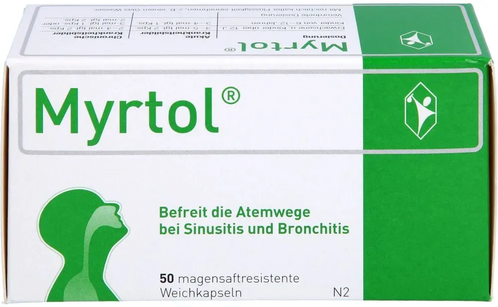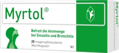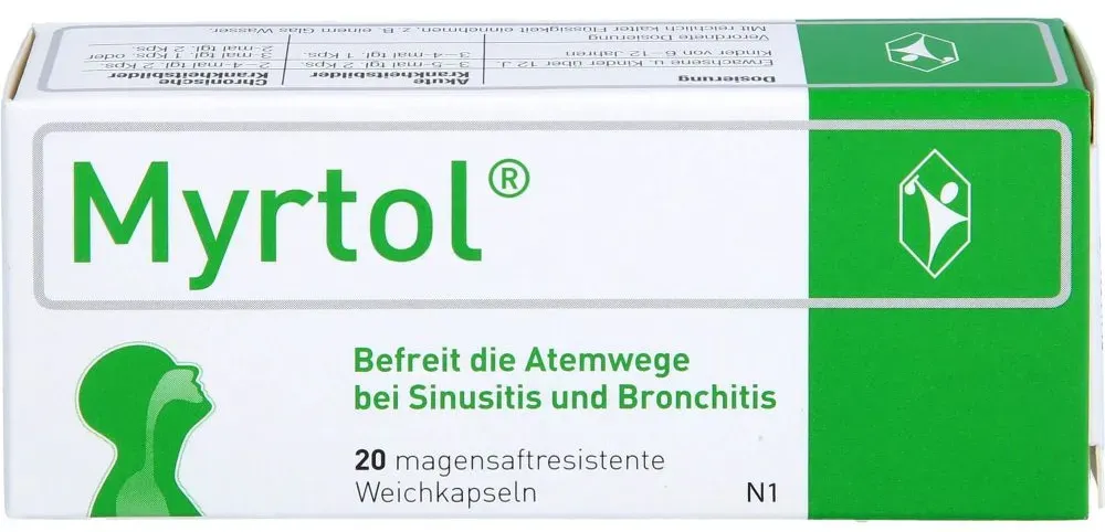 EAN: 4029125062683 - Myrtol ist ein pflanzliches Arzneimittel zur Schleimlösung in den Atemwegen. Anwendungsgebiete: Zur Schleimlösung und Erleichterung des Abhustens bei akuter und chronischer Bronchitis. Zur Schleimlösung beiEntzündungen der Nasennebenhöhlen (Sinusitis). Zur Anwendung bei Erwachsenen, Jugendlichen und Kindern ab n. Arzneilich wirksamer Bestandteil: Destillat aus einer Mischung von rektifiziertem Eukalyptusöl, rektifiziertemSüßorangenöl, rektifiziertem Myrtenöl und rektifiziertem Zitronenöl (66:32:1:1). - bei ipill.de - aus Yadore Produktdaten Dieses Angebot bietet 20 Kapseln zu einem sehr guten Preis von einem bekannten Anbieter. ![]() ![]() Pohl-Boskamp MYRTOL magensaftresistente Weichkapseln 20 St