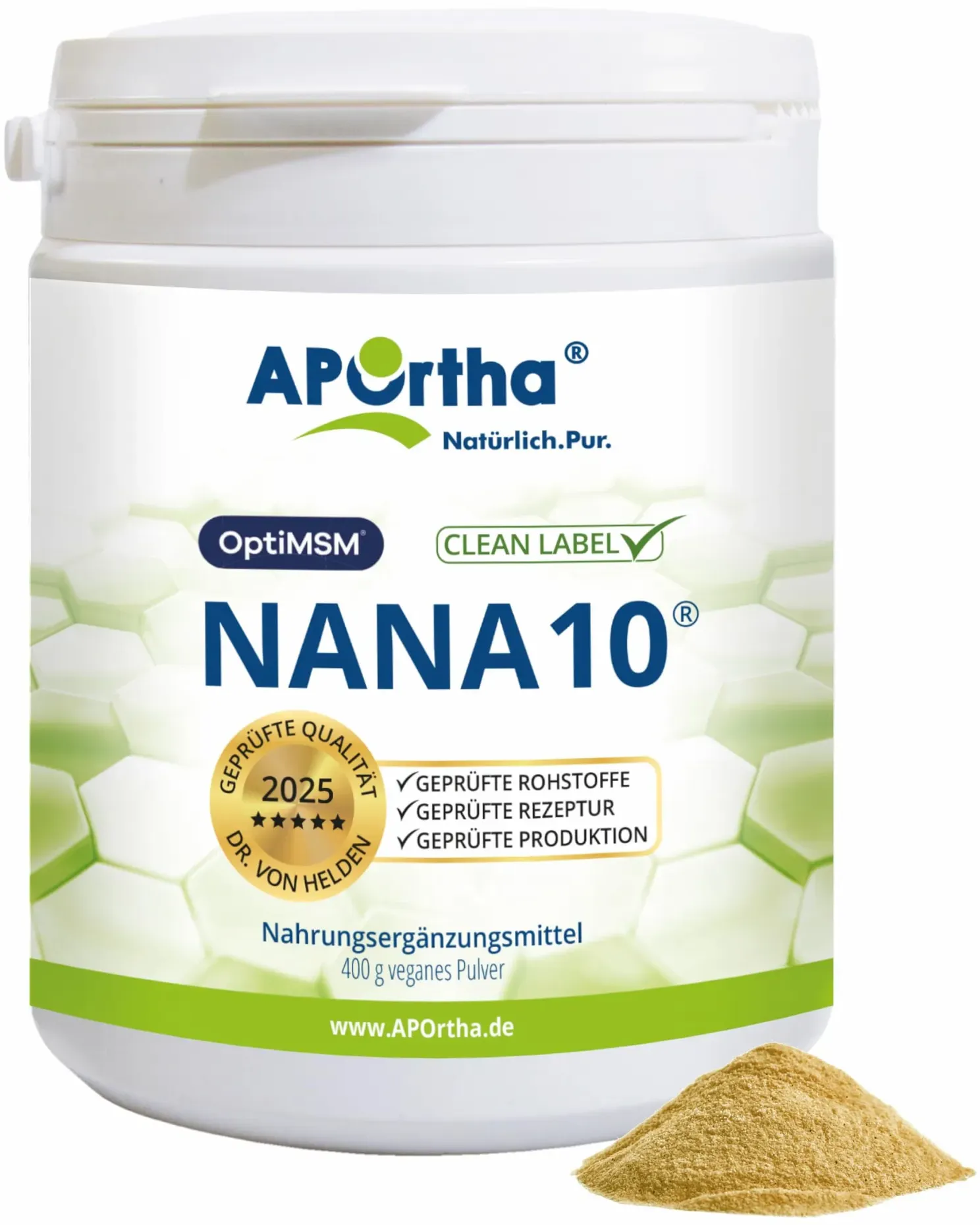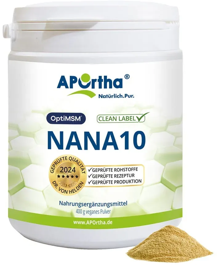 3 Händlerangebote bei billiger.de - Kategorie: Nahrungsergänzungsmittel - APOrtha - Die NANA10 -Idee Hinweis: Auf www.NANA10.de erläutert Dr. von Helden die Hintergründe zu seinem NANA10 -Konzept. Zutaten pro 400 g APOrtha NANA10 -Pulver L-Glycin: 40 g L-Glutamin: 40 g Ascorbinsäure - Vitamin C: 40 g Tri-Magnesiumdicitrat (Magnesium): 40 g MSM - Methylsulfonylmethan (OptiMSM ): 40 g Curcumawurzel-Pulver: 40 g Inulin (Agave): 40 g L-Taurin: 40 g Zimt (Ceylon): 40 g Kieselerde: 40 g Clean Label ist unsere Stärke: Dieses Produkt ist rt frei von Allergenen, Magnesiumstearat, Titandioxid, Carrageen und Polyethylenglykol (PEG) sowie von Aromen, Farb- und Süßungsmitteln. Selbstverständlich sind alle Inhaltsstoffe auf Schwermetalle und Pestizide geprüft. Wir verwenden laut Gesetzgeber auch keine Rohstoffe, die gentechnisch verändert (GMO), bestrahlt oder mit Ethylenoxid behandelt wurden. Mischung und Abfüllung in Deutschland für: APOrtha Deutschland GmbH - Lübecker Str. 2a - 22926 Ahrensburg - E-Mail: Service@APOrtha.eu Bio-Kontrollnummer: DE-SH-003-67086-HD - Bio-Kontrollstelle: DE-öKO-003 Informationen nach der Lebensmittelinformationsverordnung (LMIV) und der Health-Claim-Verordnung (HCVO) siehe Produktabbildungen. OptiMSM is a registered trademark of Balchem Corporation or its subsidiaries NANA10 ist eine Marke von Dr. von Helden - GTIN:4260329845584 Ein solides Angebot für das Nana10 Pulver, das über eBay erhältlich ist. ![]() ![]() APOrtha R - NaNa10 - eBay 400 g veganes Pulver, Rezeptur von Dr. von Helden
