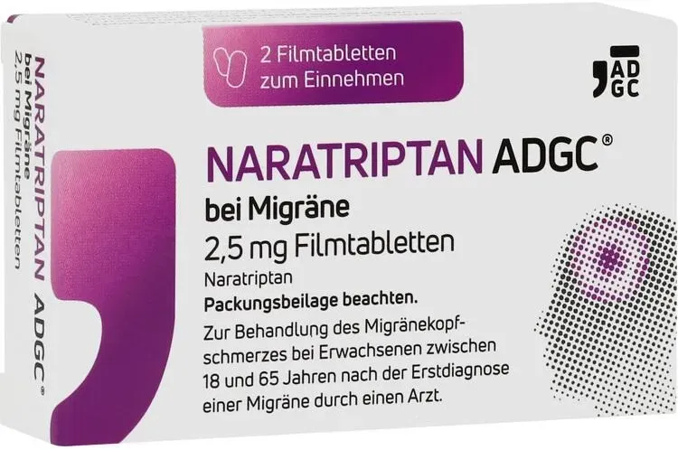 Verfügbarkeit: 2-4 Werktage - 1,11 €/Stück - Kategorie: Arzneimittel - Zentiva Pharma GmbH - GTIN:4150184985498 - PZN:18498549 - Anwendungsgebiet von Naratriptan ADGC® bei Migräne 2,5 mg FilmtablettenNaratriptan ADGC® bei Migräne 2,5 mg Filmtabletten wird zur Behandlung von akuten Migränekopfschmerzes bei Erwachsenen zwischen 18 und 6 n nach ärztlicher Erstdiagnose einer Migräne eingesetzt.Wirkungsweise von Naratriptan ADGC® bei Migräne 2,5 mg Filmtabletten Der enthaltene Wirkstoff Naratriptan wirkt verengend auf die Blutgefäße und behandelt so gezielt die Symptome der Migräne, welche durch die vorübergehende schmerzhafte Erweiterung der Blutgefäße im Kopf verursacht sein kann. Dies wiederum hilft nicht nur dabei die akuten Kopfschmerzen zu lindern, sondern auch die Begleiterscheinungen einer Migräneattacke, wie z. B. übelkeit, Erbrechen, Licht- und Lärmempfindlichkeit.Wirkstoffe / Inhaltsstoffe / ZutatenInhaltsstoffe von Naratriptan ADGC® bei Migräne 2,5 mg Filmtabletten : Der Wirkstoff ist Naratriptan. Jede Filmtablette enthält: 2,5 mg Naratriptan (als Naratriptanhydrochlorid). Die sonstigen Bestandteile sind: Tablettenkern: Lactose, Mikrokristalline Cellulose, Croscarmellose-Natrium und Magnesiumstearat (Ph.Eur.) [pflanzlich]. Filmüberzug: Hypromellose, Titandioxid (E171), Triacetin, Eisen(III)-hydroxid-oxid x H20 (E172), Indigocarmin-Aluminiumsalz (E132).GegenanzeigenDas Arzneimittel darf nicht angewendet werden:wenn Sie allergisch gegen ... Eine kostengünstige Option von 1A Pharma, die für viele Nutzer eine gute Wahl ist. ![]() ![]() 1 A Pharma Naratriptan-1A Pharma bei Migräne 2,5mg