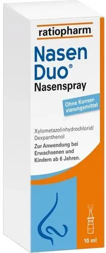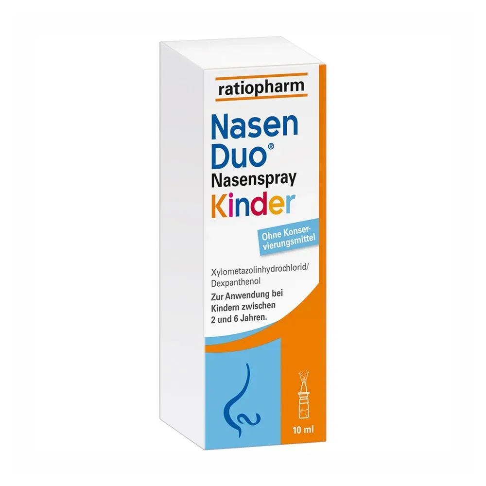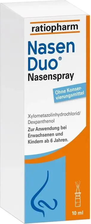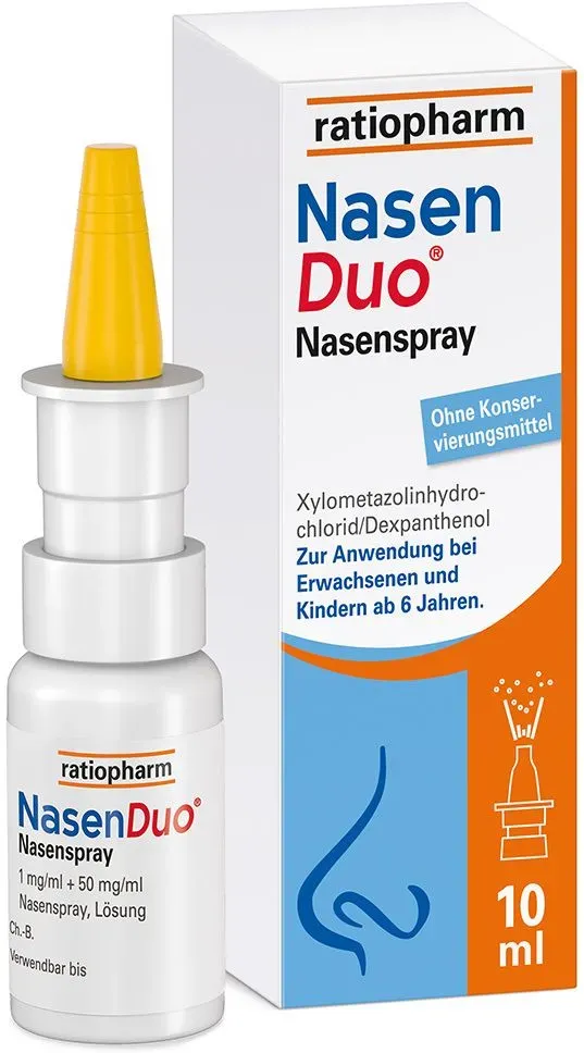 EAN: 4150125215431 - NasenDuo Nasenspray - Stark zum Schnupfen, sanft zur Nase Schnupfen - ein lästiger Gast, den man schneller mit nach Hause bringt, als es einem lieb ist. Auch wenn die Symptome in der Regel harmlos sind, bedeutet es meistens, dass wir den Anforderungen des Alltags nicht mehr gewachsen sind. Vor allem nachts verhindert Schnupfen das Ein- und Durchschlafen. NasenDuo Nasenspray befreit die Nase schnell und langanhaltend - damit Sie wieder Ihren Alltag meistern und erholsam schlafen können. NasenDuo Nasenspray mit 2-fach-Wirkung: Wirkt abschwellend und fördert die Wundheilung NasenDuo Nasenspray lindert Schnupfen mit 2-fach-Wirkung. Der Wirkstoff Xylometazolin wirkt abschwellend und befreit die Nase schnell und langanhaltend - damit Sie wieder durchatmen können. Durch den pflegenden Wirkstoff Dexpanthenol wird die Wundheilung gefördert und die durch den Schnupfen angegriffene Nasenschleimhaut geschützt. Wie alle Schnupfensprays von ratiopharm kommt auch NasenDuo Nasenspray ganz ohne schädliche Konservierungsmittel aus. Dadurch ist das abschwellende Nasenspray gesünder für die Nasenschleimhaut und es reizt oder schädigt diese nicht zusätzlich. NasenDuo Nasenspray ist für Erwachsene, Jugendliche und Kinder ab n geeignet. Für Kinder ab n ist gibt es speziell NasenDuo Nasenspray Kinder in der altersgerechten Dosierung. Stark zum Schnupfen und sanft zur Nase Xylometazolin befreit die Nase schnell und langanhaltend Dexpanthenol fördert die Wundheilung Frei von ... Dieses Angebot ist das günstigste für das Nasenspray für Kinder und somit ideal für preisbewusste Käufer. ![]() ![]() Ratiopharm NASENDUO Nasenspray Kinder 10 ml