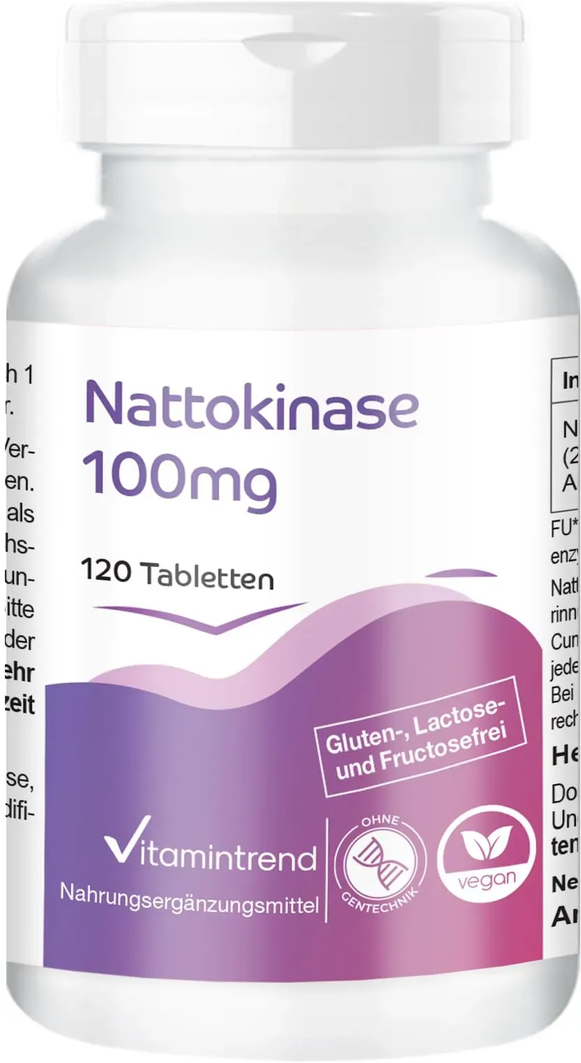 Kategorie: Nahrungsergänzungsmittel - GymBeam - GTIN:8586022211393 - Hochwertiges Nattokinase-Enzym: Du erhältst bei uns Nattokinase-Kapseln, die jeweils 100 mg des effektiven Enzyms enthalten. Dieses wird aus Natt , einem traditionellen japanischen Gericht, gewonnen, indem Sojabohnen mit Bacillus subtilis fermentiert werden. Enzymaktivität: Mit Nattokinase-Enzym, einem natürlichen Katalysator, der chemische Reaktionen und Verdauung unterstützt, kannst du durch die Einnahme dieser Kapseln deine natürliche Enzymaktivität steigern. Nattokinase-Kapseln: Bieten dir eine einfache und praktische Möglichkeit, dieses wertvolle Enzym zu konsumieren. Mit 100 mg Nattokinase pro Portion sind sie ideal für den täglichen Gebrauch und perfekt zur Unterstützung deiner Gesundheit. Nattokinase: Gewonnen aus natt , einem traditionellen japanischen Gericht aus fermentierten Sojabohnen, ren unsere Kapseln höchste Qualität und Wirksamkeit durch traditionelle Herstellungsmethoden. Natürliche Kapseln: Genieße die Vorteile von fermentierten Sojabohnen, die das reine Nattokinase-Enzym liefern. Unsere Kapseln sind frei von künstlichen Zusatzstoffen und bestehen ausschließlich aus natürlichen Zutaten für optimale Gesundheitsergebnisse. - 11,95 Euro bei Amazon Marketplace Health & Personal Care - gefunden von billiger.de Dieses Produkt bietet eine gute Menge an Tabletten zu einem fairen Preis und ist vegan. ![]() ![]() Vitamintrend Nattokinase hochdosiert 100mg, 120 Tabletten, 2000 FU pro Tablette, Nahrungsergänzungsmittel vegan ohne Magnesiumstearat, in Deutschland hergestellt