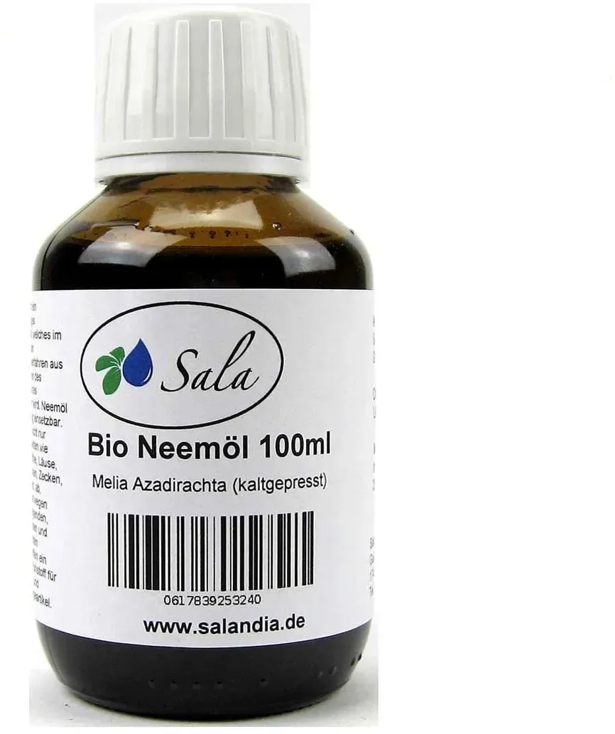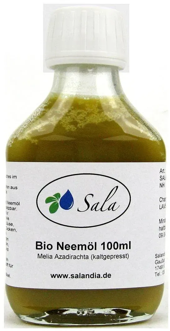 Zustand: Neu - 67,10 € / l - Trägeröle - lavita LaVita - - EAN: 4250217913426 - Neemöl kaltgepresst. Reines Neemöl ist bei Raumtemperatur von zähflüssiger bis fester Konsistenz. Bei Temperaturen oberhalb 25° C wird es flüssig. Zur einfachen Anwendung empfiehlt es sich, die Flasche mit reinem Neemöl in einen Topf mit warmem Wassers zu stellen und dann die nötige Menge zu entnehmen. Vielseitige Anwendung. Zur Pflanzenpflege. Beliebt in Kosmetikprodukten. - Verkäufer: ecotrade-GmbH im amazon.de Marketplace ![]() ![]() Sala Neemöl kaltgepresst BIO (100 ml NH-Glasflasche)