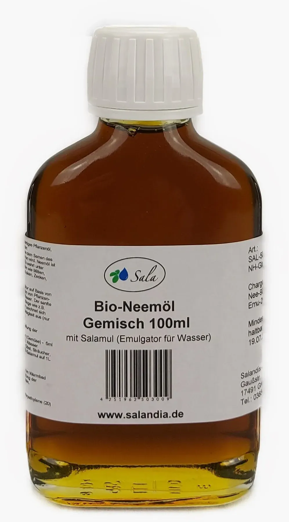 Kategorie: Ganzkörperpflege - Sala - GTIN:4251962503009 - Unser BIO-Neemöl (kbA) ist ein hochwertiges kaltgepresstes Pflanzenöl aus dem Samen des Neembaumes gewonnen wird. Pure Neemöl ist vielseitig in Kosmetik oder Pflanzenpflege einsetzbar. Alle Anwendungsmöglichkeiten sind in der Fachliteratur oder im Internet zu finden. Salamul ist ein Emulgator auf Basis von Sorbitol zum emulgieren von Pflanzen- und Mineralölen mit Wasser. Der sanfte Emulgator schont Nützlinge wie z.B. Bienen. Der Emulgator zeichnet sich durch seine hohe Ergiebigkeit aus (nur noch 10% Emulgator). Salamul ist ein Emulgator auf Basis von Sorbitol zum emulgieren von Pflanzen- und Mineralölen mit Wasser. Der sanfte Emulgator schont Nützlinge wie z.B. Bienen. Der Emulgator zeichnet sich durch seine hohe Ergiebigkeit aus (nur noch 10% Emulgator). ANWENDUNG ZUR HERSTELLUNG DER SPRüHLöSUNG: weichblättrige Pflanzen (Gemüse) - 5ml Neemöl-Salamul auf 1L Wasser // hartblättrige Pflanzen (Obst, Sträucher, Bäume) - 10ml Neemöl-Salamul auf 1L Wasser HINWEISE:Im festen Zustand (Neemöl kann unter 21 C fest werden) bitte im Warmbad/warmer Ort erwärmen. Vor Anwendung der Sprühlösung bitte gut schütteln. Die angesetzte Lösung sofort verbrauchen. Die Anwendung kann durch eine Sprühflasche oder großflächig über die Gießkanne erfolgen. In besonderen Anwendungsfällen sollte das Blattwerk direkt besprüht werden und innerhalb von 7-10 Werktagen wiederholt werden. Je nach Stärke der äußeren Einwirkung kann die Anwendungsdauer ... ![]() ![]() Neemöl mit - Emulgator 30ml