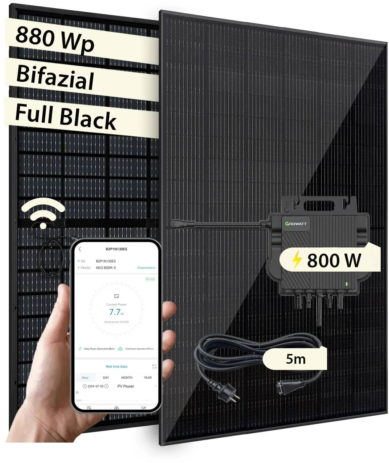 Zustand: Neu - Netzgebundene Systeme Netzgebundene Photovoltaikanlagen - VALE - 301007 - EAN: 4262361724339 - Private Stromerzeugung: Das bifaziale Balkonkraftwerk für beidseitige Energiegewinnung mit Growatt Neo 800M-X Wechselrichter & integriertem WiFi sorgt für zuverlässigen Strom bei dir zu Hause Einfache Installation: Das steckerfertige Solarpanel Set enthält alle benötigten Kabel, sodass du ohne Elektriker schnell & unkompliziert Solarenergie erzeugen kannst Hochwertige Solaranlage: Das bifaziale Balkonkraftwerk überzeugt mit eleganter Full-Black-Optik & bifazialen Modulen, die bis zu 30% mehr Leistung liefern. Es umfasst 2x 440Wp Solarpanels, einen Growatt Neo 800M-X Wechselrichter & das notwendige Kabel Mit App-Steuerung: Die dazugehörige App ermöglicht eine praktische Übersicht mit Fernüberwachung für ein kosteneffektives Energiemanagement Langfristige Sicherheit: 1 Standard für den Wechselrichter mit hochwertiger Verarbeitung für eine langanhaltende und zuverlässige Leistungsentwicklung - Verkäufer: VALE GmbH im amazon.de Marketplace Ein umfassendes Balkonkraftwerk-Set mit bifazialen Modulen, Wechselrichter und App-Steuerung für eine effiziente Nutzung. ![]() ![]() VALE Balkonkraftwerk Bifazial 880 Wp Full Black - Growatt Neo 800M-X Wechselrichter - Solarpanel Set - 5m AC-Kabel - inkl. App-Steuerung