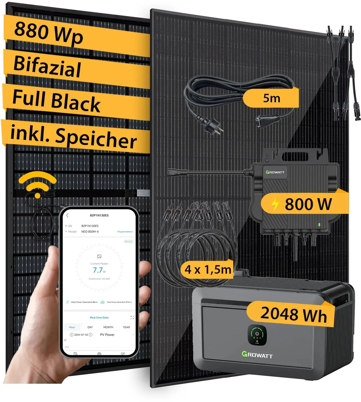 ![]() ![]() Growatt Balkonkraftwerk 880W Growatt NOAH 2000 Speicher mit 800W Wechselrichter, Halterung, (2x JA Solar 440Wp, Growatt NOAH 2000 Speicher mit 800W Wechselrichter), Growatt NEO-800M-X: Integrierte WiFi-Kommunikation