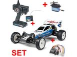 Tamiya - EAN: 4251002713788 - Das D-Edition Exklusiv Komplett Set, rundum Sorglos Paket! Ideal für Einsteiger und Jugendliche! Alles im einen Set was zum Zusammenbau benötigt wird! Nur noch die passende Tamiya PS- Farbe aussuchen, Ladegerät, Fahrakku und Senderbatterien werden benötigt. TAMIYA präsentiert mit dem Neo Fighter den Nachfolger des absoluten s unter den 2WD RC-Buggys, dem legendären Super Fighter G. Dieser neue Einsteigerrenner bietet optimale Voraussetzungen für Fahrspaß in jedem Gelände. Dabei überzeugt das Modell vor allem im Punkto Qualität und Robustheit, es ist ja auch das Standardmodell für den TAMIYA FIGHTER-CUP, der weltweit größten RC-Jugendrennserie. Der etwas über 1 kg schwere Neo Fighter im Maßstab 1:10 ist mit gut 40 cm etwas länger geworden und bietet dank des nun größeren Radstands noch mehr Spurtreue bei schnellen Fahrten. Sein schmales, fast röhrenförmiges DT-03 Chassis beinhaltet gut geschützt Elektronik und Mechanik. Einzelradaufhängung, Differenzial, öldruckstoßdämpfer und die flexible Polykarbont-Karosserie, die Designelemente klassischer Modelle enthält, sind Serie. Highlight ist der elektronische Fahrregler, der sowohl für Bürsten- alsauch Brushless-Motoren geeignet ist. Technische Daten Neo Fighter Buggy: - schlagfestes Wannen-Rahmenchassis DT-03- Rammschutz vorne- Doppelte Querlenker- Einzelradaufhängung vorne und hinten- öldruckstoßdämpfer- 2WD Heckantrieb- Differenzialgetriebe- Polykarbonat-Karosserie- Elektromotor Typ 540 Torque ... Die Brushless-Edition bietet eine deutlich höhere Leistung und ist ideal für fortgeschrittene Fahrer, die mehr Speed wünschen. ![]() ![]() Tamiya Neo - Fighter DT-03 eBay 2WD Buggy Brushless-Edition Komplettset #300058587BLSET